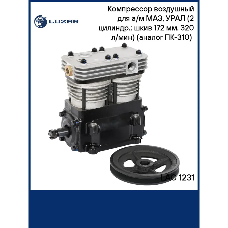Компрессор воздушный для а/м МАЗ, УРАЛ (2 цилиндр.; шкив 172 мм. 320 л/мин) (аналог ПК-310) (LAC 1231) Характеристики: Артикул: LAC 1231 OEM номера: PK310, ПК310 Номинальный рабочий объем, см3: 320 Номинальная частота вращения коленчатого вала, об/мин: 2500 Потребляемая мощность, кВт: 4,5 Производительность не менее, л/мин: >450 (27 м3/ч) Выброс масла с нагнетаемым воздухом не более, г/час: 1 Количество на автомобиль: 1 Система смазки: под давлением от системы смазки двигателя Система охлаждения: жидкостная от системы охлаждения двигателя Комплектация (кол-во деталей, описание): шкив 172 мм. Рабочее давление, Bar: 8-10 Комплектация: Компрессор воздушный - 1 шт Шкив - 1 шт Гарантия: от 1 года.
