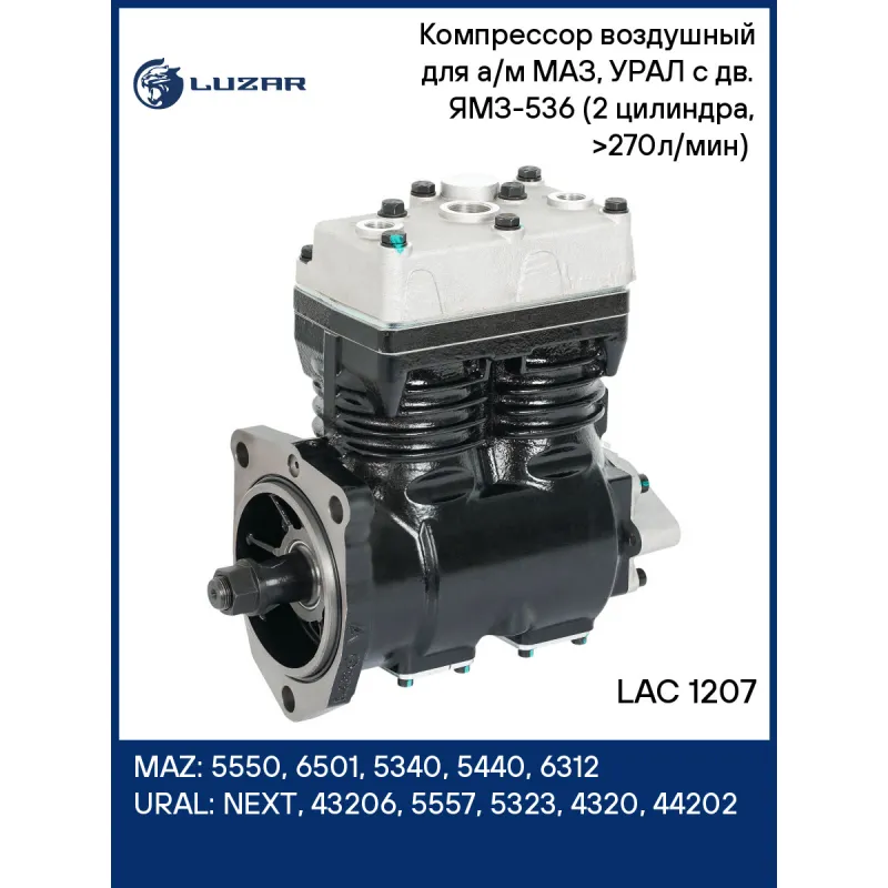 Компрессор воздушный для а/м МАЗ, УРАЛ с дв. ЯМЗ-536 (2 цилиндра, >270л/мин) (аналог LP4874) Характеристики: Артикул: LAC 1207 OEM номера: 5363509004, 536350901510, LP4874, K146702N00 Номинальный рабочий объем, см3: 497 Номинальная частота вращения коленчатого вала, об/мин: 2500 Потребляемая мощность, кВт: 4,5 Производительность не менее, л/мин: >450 (27 м3/ч) Выброс масла с нагнетаемым воздухом не более, г/час: 1 Количество на автомобиль: 1 Система смазки: под давлением от системы смазки двигателя Система охлаждения: жидкостная от системы охлаждения двигателя Комплектация (кол-во деталей, описание): без шестерни Рабочее давление, Bar: 8-10 Комплектация: Компрессор воздушный - 1 шт Гарантия: от 1 года.