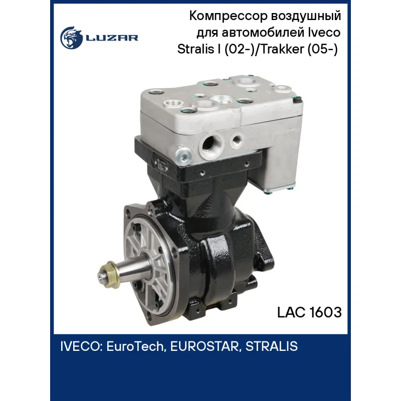 Компрессор воздушный для автомобилей Iveco Stralis I (02-)/Trakker (05-) (1 цилиндр, 352 см3) Характеристики: Артикул: LAC 1603 OEM номера: 504308489, 41211220, 41211219, 4123520200 Номинальный рабочий объем, см3: 352 Номинальная частота вращения коленчатого вала, об/мин: 2500 Потребляемая мощность, кВт: 4,5 Производительность не менее, л/мин: >450 (27 м3/ч) Выброс масла с нагнетаемым воздухом не более, г/час: 1 Система смазки: под давлением от системы смазки двигателя Система охлаждения: жидкостная от системы охлаждения двигателя Количество на автомобиль: 1 Комплектация: Компрессор воздушный - 1 шт Гарантия: от 1 года.