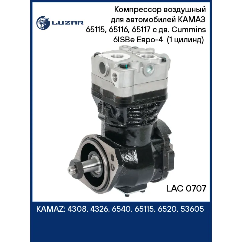 Компрессор воздушный для автомобилей КАМАЗ 65115, 65116, 65117 c дв. Cummins 6ISBe Eвро-4 (1 цилинд) (аналог LK8926) Характеристики: Артикул: LAC 0707 OEM номера: LK8926, K124046N50 Номинальный рабочий объем, см3: 358 Номинальная частота вращения коленчатого вала, об/мин: 2500 Потребляемая мощность, кВт: 4,5 Производительность не менее, л/мин: 450 (27 м3/ч) Выброс масла с нагнетаемым воздухом не более, г/час: 1 Система смазки: под давлением от системы смазки двигателя Система охлаждения: жидкостная от системы охлаждения двигателя Количество на автомобиль: 1 Комплектация: Компрессор воздушный - 1 шт Гарантия: от 1 года.