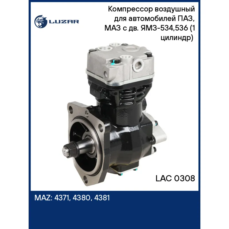 Компрессор воздушный для автомобилей ПАЗ, МАЗ c дв. ЯМЗ-534,536 (1 цилиндр) (аналог LK3894) Характеристики: Артикул: LAC 0308 OEM номера: 53403509004, 5340350901040, 5340350901520, LK3894, K142362N00 Номинальный рабочий объем, см3: 226 Номинальная частота вращения коленчатого вала, об/мин: 2500 Потребляемая мощность, кВт: 4,5 Производительность не менее, л/мин: 450 Выброс масла с нагнетаемым воздухом не более, г/час: 1 Система смазки: под давлением от системы смазки двигателя Система охлаждения: жидкостная от системы охлаждения двигателя Количество на автомобиль: 1 Комплектация: Компрессор воздушный - 1 шт Гарантия: от 1 года.