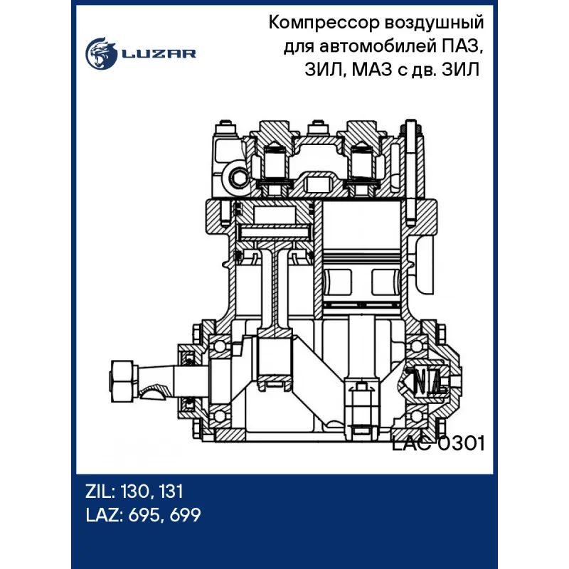 Компрессор воздушный для автомобилей ПАЗ, ЗИЛ, МАЗ с дв. ЗИЛ (2-х цилиндровый, 210л/мин, без шкива, под AP11) Характеристики: Артикул: LAC 0301 OEM номера: 1303509009Б, 130-3509009, 130350900911, 130ВААЗ350920 Номинальный рабочий объем, см3: 215 Номинальная частота вращения коленчатого вала, об/мин: 3000 Потребляемая мощность, кВт: 4,5 Производительность не менее, л/мин: 210 (12,6 м3/ч) Выброс масла с нагнетаемым воздухом не более, г/час: 1 Система смазки: под давлением от системы смазки двигателя Система охлаждения: жидкостная от системы охлаждения двигателя Количество на автомобиль: 1 Подходит для авто: ZIL 130, 131 ЛАЗ 695, 699 Для проверки применяемости отправьте VIN автомобиля через вкладку "Есть вопросы о товаре?" Комплектация: Компрессор воздушный - 1 шт Фитинг - 4 шт Гарантия: от 1 года.