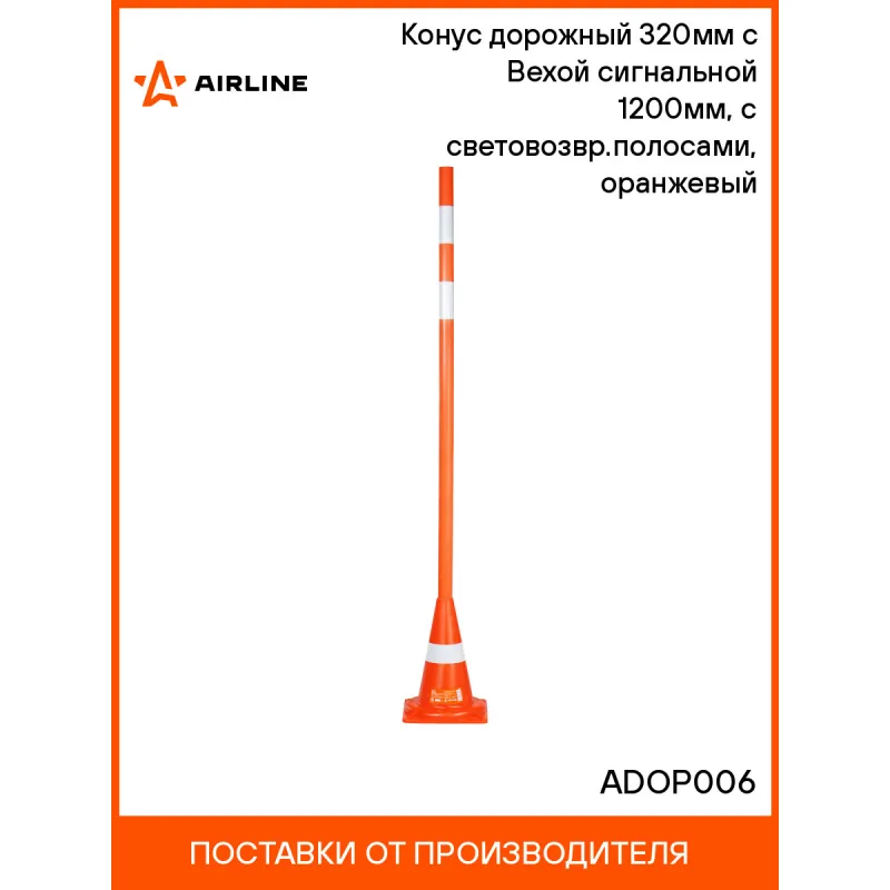 Конус дорожный 320мм с Вехой сигнальной 1200мм, с световозвр.полосами, оранжевый Описание: Представляем Вашему вниманию новое изделие - комбинированные веха оградительная и сигнальный конус. Данное комбинированное изделие успешно применяется во многих сферах: автошколы, аэропорты, массовые мероприятия, декоративное освещение. После наезда автомобиля конус восстанавливает свою форму, а оградительная веха благодаря специальному материалы и малому весу не наносит сильного повреждений автомобилю. Яркая окраска и полосы из световозвращающей пленки делают данное комбинированное изделие "ВЕХА+КОНУС" отлично заметным на дороге или автодроме даже в темное время суток. Дополнительно в комбинированное изделие "ВЕХА+КОНУС" сверху может устанавливаться сигнальный светодиодный фонарь. Параметры: Размеры: Высота конуса - 320мм, Основание конуса - 230x230мм, Высота вехи - 1200мм, Диаметр вехи - 40мм Световозвращающая разметка - 1 полоса на конусе, 2 полосы на вехе Материал изготовления: полиэтилен Характеристики: Артикул: ADOP006 Цвет: Оранжевый Материал: Мягкий пластик Высота, мм: 1200-1500 Форма основания: квадрат Размер основания, мм: 233*233 Высота полосы, мм: 50 Диаметр верхнего отверстия, мм: 40 Мин. температура эксплуатации, °С: -30 Макс. температура эксплуатации, °С: 40 Кол-во полос, шт: 3 Диаметр столбика, мм: 40 Комплектация: Веха с конусом - 1 шт Гарантия: от 1 года.