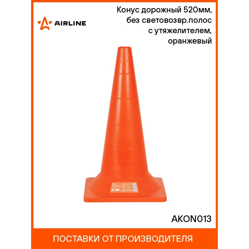 Конус дорожный 520мм, без световозвр.полос с утяжелителем, оранжевый Описание: Конусы предназначены для регулировки движения транспорта и пешеходов, помогают водителям увидеть препятствия издалека и безопасно запланировать маневр, избежав аварии. Изготовлены из специального морозостойкого пластика и редко ломаются при наезде автомобиля. С одной стороны это помогает защитить транспорт от потенциальных царапин на кузове, а с другой, позволяет дольше использовать конусы. Модель оснащена встроенным утяжелителем для большей устойчивости. Из-за увеличенного веса их тяжелее сдвинуть с места установки. В плоскости вершины присутствует отверстие нормированного диаметра 40 мм для размещения вехи или вставного сигнального фонаря ФС4. Характеристики: Артикул: AKON013 Цвет: оранжевый Материал: Мягкий пластик Вид: Упругий Форма основания: Квадрат Размер основания, мм: 285 Диаметр верхнего отверстия, мм: 40 Мин. температура эксплуатации, °С: -30 Кол-во полос, шт: 0 Макс. температура эксплуатации, °С: 60 Комплектация: Конус с наклейкой - 1 шт Гарантия: от 1 года.