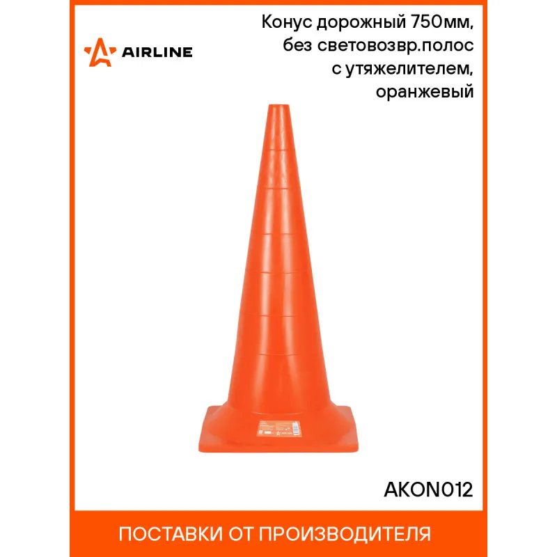 Конус дорожный 750мм, без световозвр.полос с утяжелителем, оранжевый Описание: Конусы предназначены для регулировки движения транспорта и пешеходов, помогают водителям увидеть препятствия издалека и безопасно запланировать маневр, избежав аварии. Изготовлены из специального морозостойкого пластика и редко ломаются при наезде автомобиля. С одной стороны это помогает защитить транспорт от потенциальных царапин на кузове, а с другой, позволяет дольше использовать конусы. Модель оснащена встроенным утяжелителем для большей устойчивости. Из-за увеличенного веса их тяжелее сдвинуть с места установки. В плоскости вершины присутствует отверстие нормированного диаметра 40 мм для размещения вехи или вставного сигнального фонаря ФС4. Характеристики: Артикул: AKON012 Цвет: оранжевый Материал: Мягкий пластик Высота, мм: 750 Вид: Упругий Форма основания: Квадрат Размер основания, мм: 350 Диаметр верхнего отверстия, мм: 40 Мин. температура эксплуатации, °С: -30 Макс. температура эксплуатации, °С: 60 Кол-во полос, шт: 1 Высота полосы, мм: 50 Комплектация: Конус с наклейкой - 1 шт Гарантия: от 1 года.
