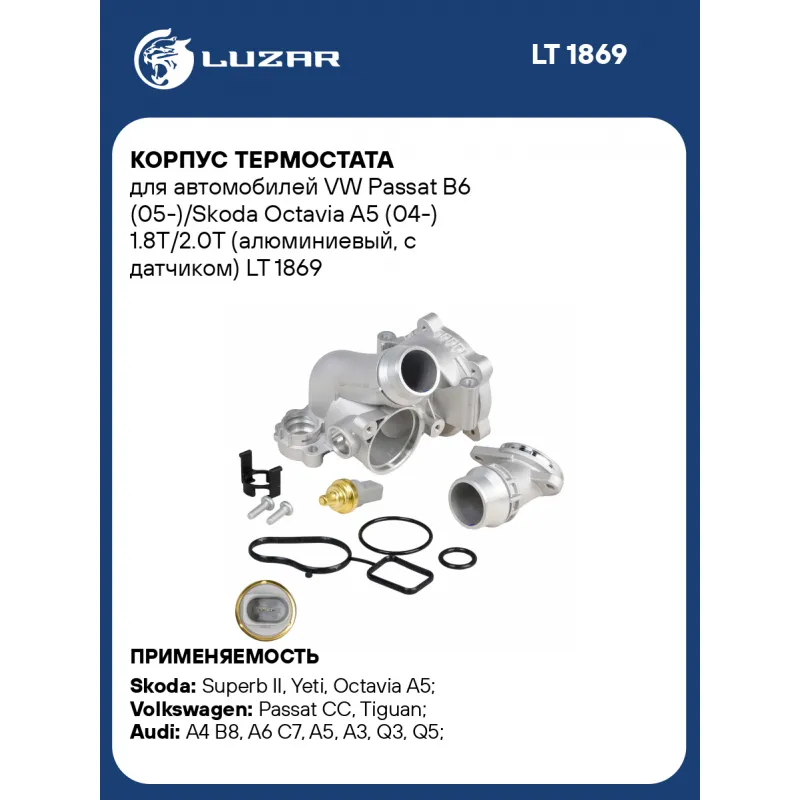 Корпус термостата для автомобилей VW Passat B6 (05-)/Skoda Octavia A5 (04-) 1.8T/2.0T (алюминиевый, с датчиком) Характеристики: Артикул: LT 1869 OEM номера: 06H121026DC, 06H121026DE, 06H121026CP, 06H121026B, 06H121026N, 06H121026AG, 06J121026B, 06J121026J, 06H121026DT, 06H121026BP, 06J121026R, 06H121026AF, 06J121026G, 06J121026L, 06J121026M, 06H121026BF, 06H121026CF, 06H121026CQ, 06H121026DR, 06H121026DS, 06H121008F, 06H121026DD, 06H121026BA, 06H121026BE, 06H121026AB, 06H121026CC, 06H121026DN Трансмиссия: MT/AT Кондиционер: + Сопутствующий товар: Насосы водяные (помпы): LWP 18H6, LWP 1836 Сопутствующий товар: Термостаты: LT 1806; LT 1808 Сопутствующий товар: Датчики температуры: LS 1823 Количество на автомобиль: 1 Материал: алюминий Датчик ОЖ: LS 1823 Комплектация (кол-во деталей, описание): датчик температуры и 2 уплотнительные прокладки; термоэлемент продается отдельно Подходит для авто: Skoda Superb II (08-), Yeti (09-), Octavia A5 (04-) Volkswagen Passat CC (08-), Tiguan (08-), Golf VI (08-), Amarok (09-), Golf V (03-), Scirocco (08-), Jetta (05-), Passat B6 (05-), Passat B7 (10-) Audi A4 B8 (07-), A6 C7 (11-), A5 (07-), A3 (03-), Q3 (11-), Q5 (08-) Для проверки применяемости отправьте VIN автомобиля через вкладку "Есть вопросы о товаре?" Комплектация: Корпус термостата - 1 шт Паспорт изделия - 1 шт Уплотнительная прокладка - 2 шт Датчик температуры - 1 шт Болт - 2 шт Фланец - 1 шт Фиксатор - 1 шт Гарантия: от 1 года.