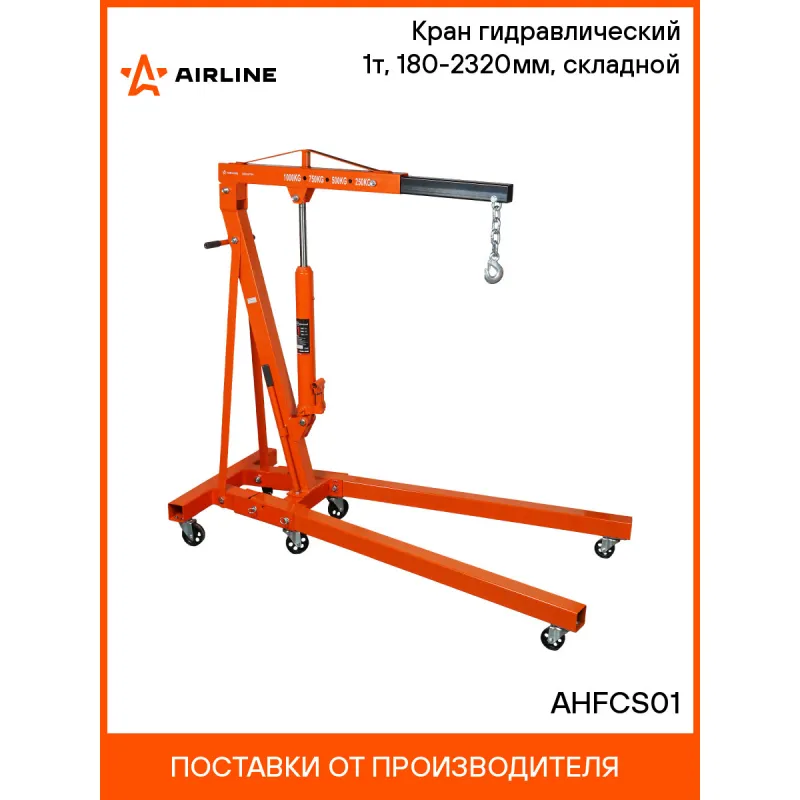 Кран гидравлический 1т, 180-2320мм, складной Описание: Гидравлический кран AIRLINE грузоподъемностью 1т это специализированное оборудование, предназначенное для подъёма, перемещения и установки тяжёлых автомобильных узлов и агрегатов, таких как двигатели и трансмиссии, в условиях станций технического обслуживания и автосервисов, гаражей. Кран изготовлен из толстолистовой стали, обеспечивающей надёжность и долговечность. Благодаря складной конструкции обеспечивает компактное хранение и экономию пространства. Механизм оснащён гидравлическим приводом, обеспечивающим плавное поднятие и опускание груза. Колесики крана позволяют легко перемещать кран в пределах рабочей зоны. Использование гидравлического крана в автосервисах и ремонтных мастерских повышает эффективность и безопасность выполнения работ, связанных с обслуживанием и ремонтом транспортных средств. Применяется со следующим продуктам: ATHE01. Характеристики: Артикул: AHFCS01 Грузоподъемность, т: 1 Длина стрелы Min, мм: 865 Длина стрелы Max, мм: 1145 Высота крюка Min, мм: 0 Высота крюка Max, мм: 2320 Высота подхвата, мм: 180 Комплектация: Цепь с крюком - 1 шт Стрела 1 секция - 1 шт Стрела 2 секция - 1 шт Гидравлический цилиндр - 1 шт Стойка - 1 шт Растяжка - 2 шт Основание - 1 шт Опора - 2 шт Колесо поворотное 90 мм - 4 шт Колесо поворотное 75 мм - 2 шт Рукоять - 1 шт Гайка М12 - 1 шт Шайба м12 - 1 шт Гайка М12 - 1 шт Шайба м14х90 - 3 шт Болт м10х 83 - 1 шт Гайка М16 - 6 шт Шайба м16 - 6 шт Болт м16х110 - 1 шт Шплинт - 4 шт Штифт - 4 шт Винт м8х16 - 8 шт Гайка М8 - 24 шт Шайба м8 - 24 шт Болт м8х16 - 16 шт Гайка М16 - 4 шт Болт М16х90 - 2 шт Болт М16х90 - 2 шт Болт м16х100 - 1 шт Болт м8х25 - 2 шт Ручка - 1 шт Паспорт изделия - 1 шт Гарантийный талон - 1 шт Ящик - 1 шт Гарантия: от 1 года.