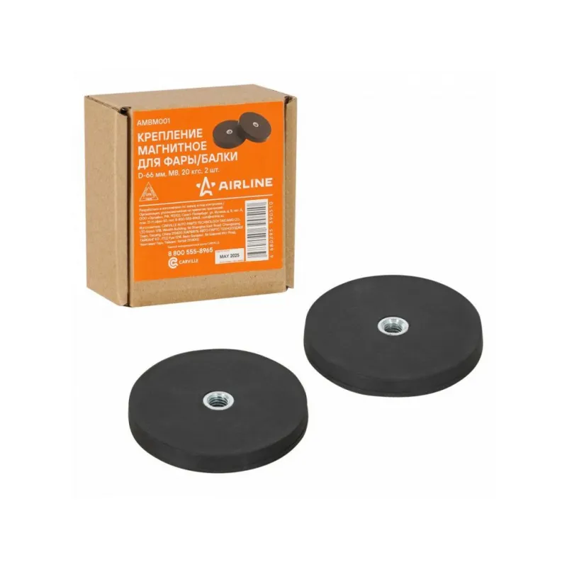 Крепление магнитное для фары/балки, D-66мм, отверстие M8, 20 кгс, комплект 2 шт. Описание: Магнитное крепление AIRLINE AMBM001 диаметром 66 мм предназначено для надежной фиксации светодиодных фар и балок на металлических поверхностях. Основой конструкции крепления являются 6 мощных неодимовых магнитов с суммарной удерживающей силой 20 кгс, обеспечивающих прочное сцепление даже на наклонных поверхностях и в условиях вибраций. Резиновое покрытие предотвращает повреждение монтажной области, а универсальное отверстие с резьбой M8 позволяет использовать крепление с различными типами фар и балок. Магнитное крепление разработано для монтажа на спецтехнике, автомобилях и других металлоконструкциях, обеспечивая простую установку без необходимости сверления. Автосвет AIRLINE – надежное освещение для уверенной поездки в любых условиях. Характеристики: Артикул: AMBM001 Материал корпуса: Неодимовый магнит, Резина Удерживающая сила магнита, кгс: 20 Тип отверстия: M8 Диаметр магнитного крепления, мм: 66 Комплектация: Магнитное крепление - 2 шт Упаковочная коробка - 1 шт Гарантия: от 1 года.