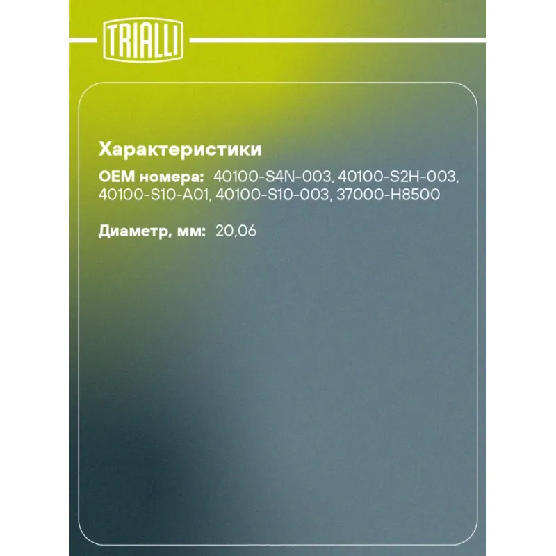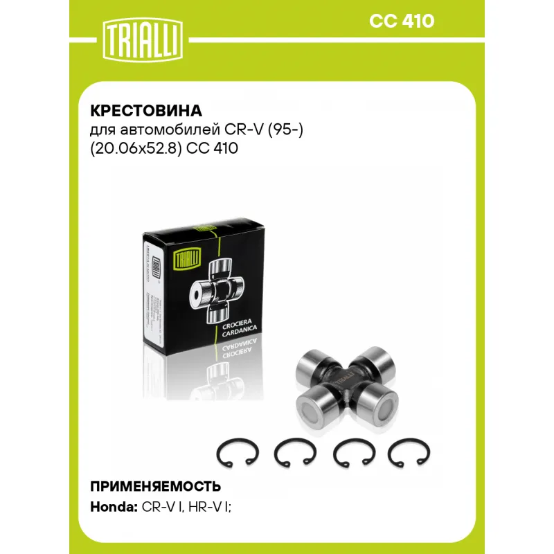 Крестовина для автомобилей CR-V (95-) (20.06x52.8) Характеристики: Артикул: CC 410 OEM номера: 40100-S4N-003, 40100-S2H-003, 40100-S10-A01, 40100-S10-003, 37000-H8500 Количество на автомобиль: 1 Диаметр, мм: 20.06 H: 52.8 Гарантийный срок: 1 год/30 000 км Товарная линейка: BLACK Подходит для авто: Honda CR-V I (95-), HR-V I (98-) Для проверки применяемости отправьте VIN автомобиля через вкладку "Есть вопросы о товаре?" Комплектация: Крестовина - 1 шт Стопорное кольцо - 4 шт Гарантия: от 1 года.