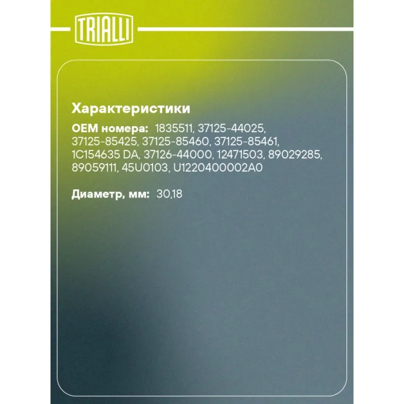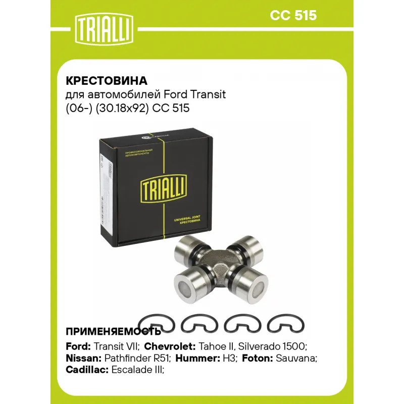 Крестовина для автомобилей Ford Transit (06-) (30.18x92) Характеристики: Артикул: CC 515 OEM номера: 1835511, 37125-44025, 37125-85425, 37125-85460, 37125-85461, 1C154635 DA, 37126-44000, 12471503, 89029285, 89059111, 45U0103, U1220400002A0 Количество на автомобиль: 1 Диаметр, мм: 30,18 H: 92 Гарантийный срок: 1 год/30 000 км Товарная линейка: BLACK Подходит для авто: Ford Transit VII (06-), Transit VII (06-) Chevrolet Tahoe II (99-), Silverado 1500 (07-), Tahoe (06-) Nissan Pathfinder R51 (05-) Hummer H3 (05-) Foton Sauvana (15-) Cadillac Escalade III (06-) Для проверки применяемости отправьте VIN автомобиля через вкладку "Есть вопросы о товаре?" Комплектация: Крестовина - 1 шт Стопорное кольцо - 4 шт Гарантия: от 1 года.