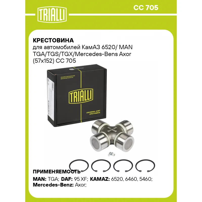 Крестовина для автомобилей КамАЗ 6520/ MAN TGA/TGS/TGX/Mercedes-Bens Axor (57x152) Характеристики: Артикул: CC 705 OEM номера: 1235571, 81.39126.6006, 81.39108.6048, 3874100031, 6520-2205025, 45104-2205100-90, 45104-2205101-90, A3874100031 Сопутствующий товар: Крестовины: CC 706 Количество на автомобиль: 1 Диаметр, мм: 57 Особенности конструкции:: с тавотницей H: 152 Гарантийный срок: 1 год/30 000 км Товарная линейка: BLACK Подходит для авто: MAN TGA (00-) DAF 95 XF (97-) КамаАЗ 6520, 6460, 5460 Mercedes-Benz Axor (01-) Для проверки применяемости отправьте VIN автомобиля через вкладку "Есть вопросы о товаре?" Комплектация: Крестовина - 1 шт Стопорное кольцо - 4 шт Гарантия: от 1 года.
