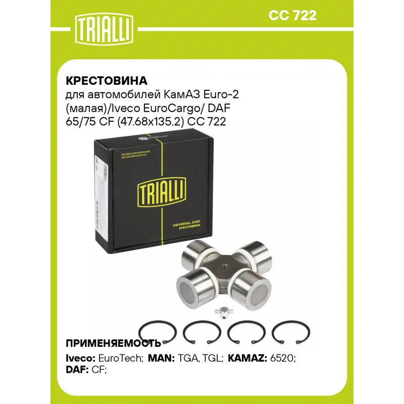 Крестовина для автомобилей КамАЗ Euro-2 (малая)/Iveco EuroCargo/ DAF 65/75 CF (47.68x135.2) Характеристики: Артикул: CC 722 OEM номера: 1250299, 0 9316 0516, 81.39108.6050, 50 01 836 379, 81.39370.6002, 81.39370.6022, 81.39370.6102, 93160516, 9 319 2881, 4 253 3783, 81.393.746.001, 82.391.266.009, 6520-2201025-10 Особенности конструкции:: с тавотницей Количество на автомобиль: 1 Диаметр, мм: 47.68 H: 135.2 Гарантийный срок: 1 год/30 000 км Товарная линейка: BLACK Подходит для авто: Iveco EuroTech (98-) MAN TGA (00-), TGL (05-) КамаАЗ 6520 DAF CF (13-) Для проверки применяемости отправьте VIN автомобиля через вкладку "Есть вопросы о товаре?" Комплектация: Крестовина - 1 шт Стопорное кольцо - 4 шт Тавотница - 1 шт Гарантия: от 1 года.