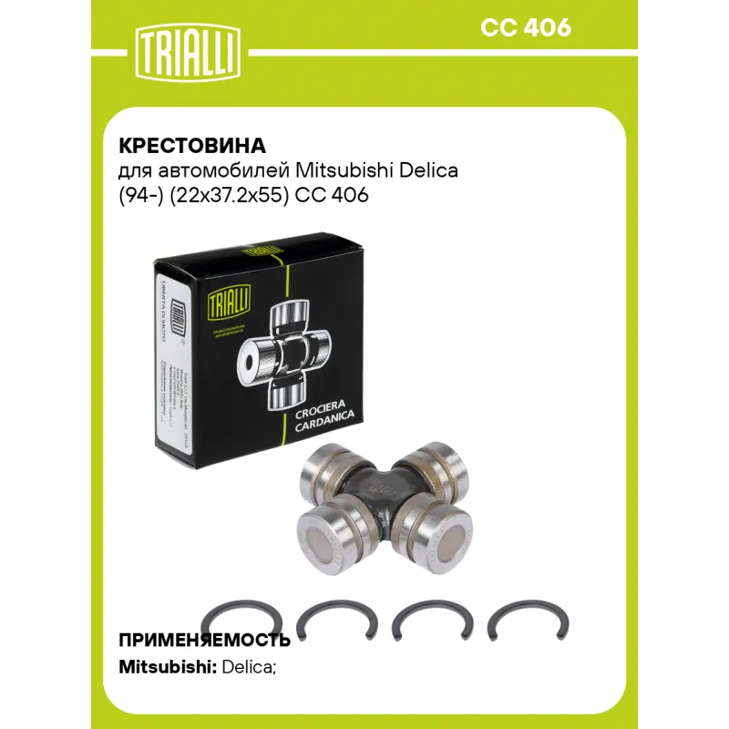 Крестовина для автомобилей Mitsubishi Delica (94-) (22x37.2x55) Характеристики: Артикул: CC 406 OEM номера: 64371-10900, 91271-08200 Гарантийный срок: 1 год/30 000 км Количество на автомобиль: 1 Диаметр, мм: 22 H: 55 H1: 37,2 Товарная линейка: BLACK Подходит для авто: Mitsubishi Delica (94-) Для проверки применяемости отправьте VIN автомобиля через вкладку "Есть вопросы о товаре?" Комплектация: Крестовина - 1 шт Стопорное кольцо - 4 шт Гарантия: от 1 года.