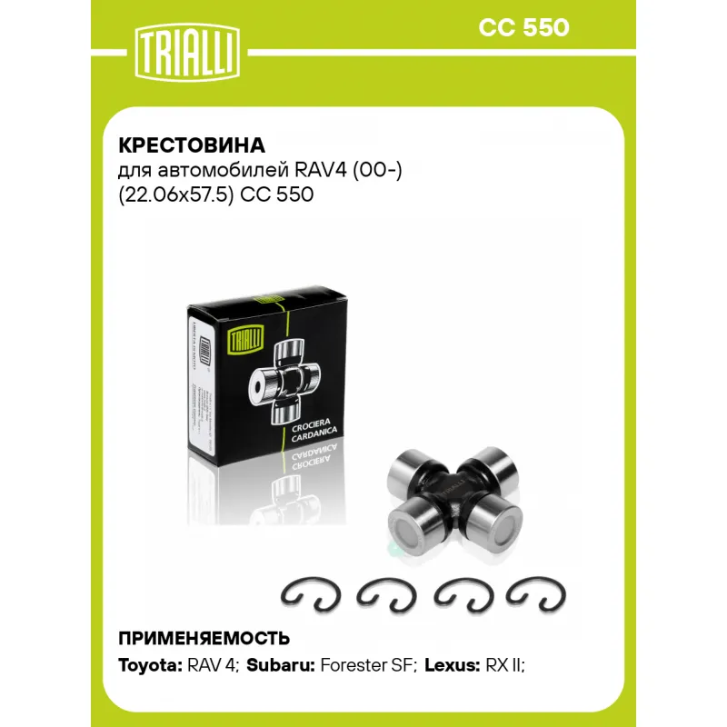 Крестовина для автомобилей RAV4 (00-) (22.06x57.5) Характеристики: Артикул: CC 550 OEM номера: 04371-13020, 27111-AJ111, 27111-FE062, 27031-FC030 Сопутствующий товар: Крестовины: CC 912 Количество на автомобиль: 1 Диаметр, мм: 22.06 H: 57.5 Гарантийный срок: 1 год/30 000 км Товарная линейка: BLACK Подходит для авто: Toyota RAV 4 (00-), RAV 4 (00-) Subaru Forester SF (97-) Lexus RX II (03-) Для проверки применяемости отправьте VIN автомобиля через вкладку "Есть вопросы о товаре?" Комплектация: Крестовина - 1 шт Стопорное кольцо - 4 шт Гарантия: от 1 года.