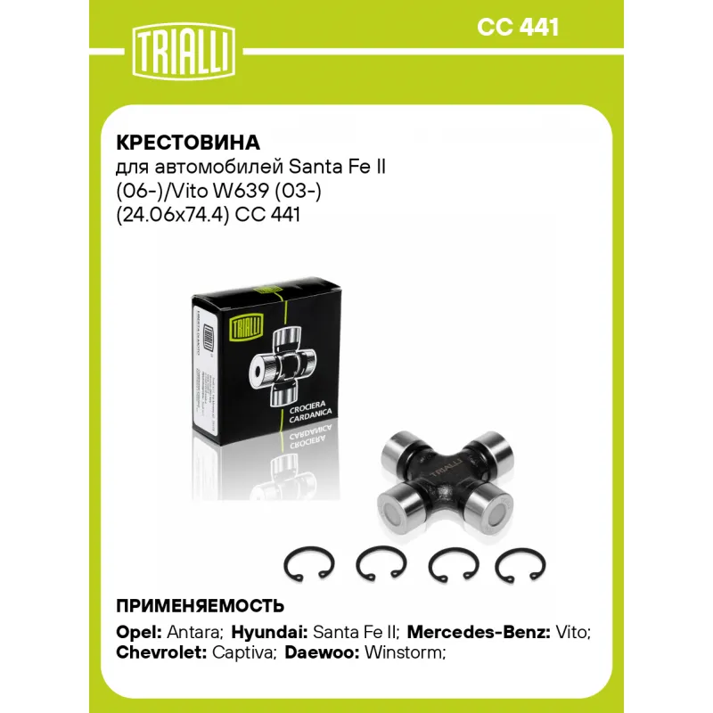 Крестовина для автомобилей Santa Fe II (06-)/Vito W639 (03-) (24.06x74.4) Характеристики: Артикул: CC 441 OEM номера: A6014100231, A0004100131, A123 410 01 31, A3094100231, 04 46 073, 20781756, 0004100131, 1234100131, 3094100231, 4100131, 6014100231 Количество на автомобиль: 1 Диаметр, мм: 24,06 H: 74,4 Гарантийный срок: 1 год/30 000 км Товарная линейка: BLACK Подходит для авто: Opel Antara (06-), Antara (06-) Hyundai Santa Fe II (06-) Mercedes-Benz Vito (W639) (03-) Chevrolet Captiva (06-) Daewoo Winstorm (07-), Winstorm (07-) Для проверки применяемости отправьте VIN автомобиля через вкладку "Есть вопросы о товаре?" Комплектация: Крестовина - 1 шт Стопорное кольцо - 4 шт Гарантия: от 1 года.