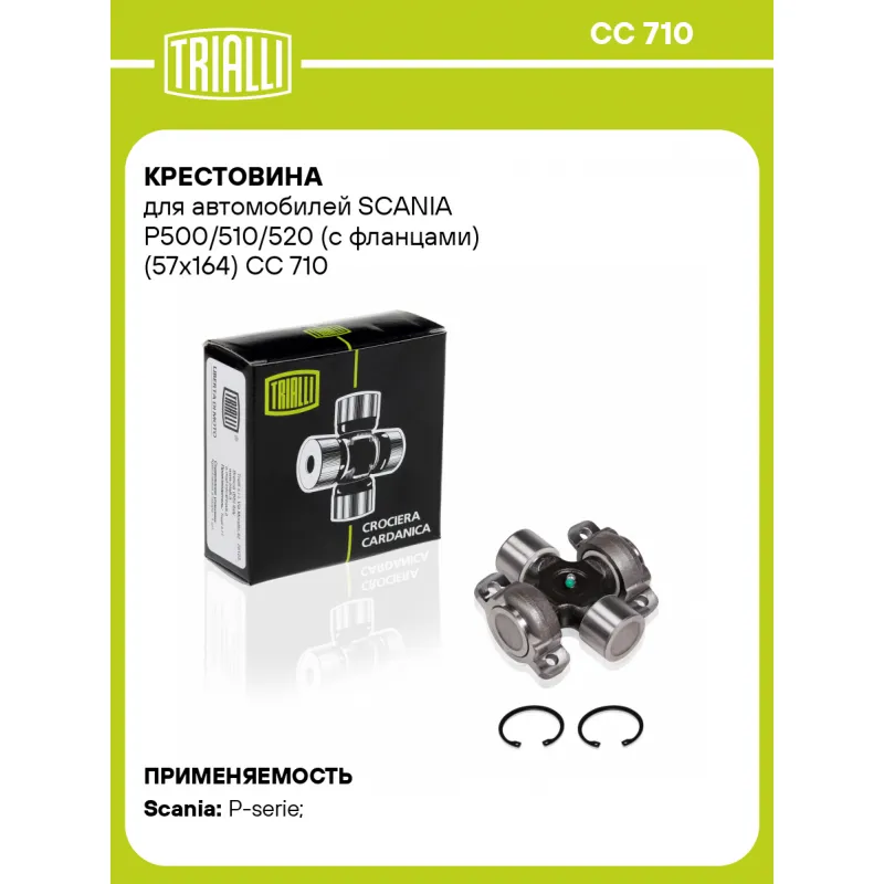 Крестовина для автомобилей SCANIA P500/510/520 (с фланцами) (57x164) Характеристики: Артикул: CC 710 OEM номера: 1 797 425, 1879540S1, 0337060, 0366437, 0390225, 1541071, 1765830S1, 1766467, 1879540 Количество на автомобиль: 1 Диаметр, мм: 57 Особенности конструкции:: с тавотницей H: 164 Гарантийный срок: 1 год/30 000 км Товарная линейка: BLACK Угол посадочной поверхности, градусы: 5 Расстояние между креплениями, мм: 126/95 Подходит для авто: Scania P-serie (04-) Для проверки применяемости отправьте VIN автомобиля через вкладку "Есть вопросы о товаре?" Комплектация: Крестовина в сборе с фланцами - 1 шт Стопорное кольцо - 2 шт Гарантия: от 1 года.
