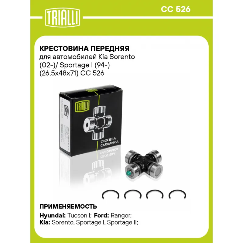 Крестовина передняя для автомобилей Kia Sorento (02-)/ Sportage I (94-) (26.5x48x71) Характеристики: Артикул: CC 526 OEM номера: 0N010-25-060A, 49598-3E200, 0K01125060, 49598-2E000, 495983E000, 1757-89-251, 3 636 482, 01757-25060, 175725060, 8BS1-25-060, N090-89-251 Сопутствующий товар: Крестовины: CC 542 Количество на автомобиль: 1 Диаметр, мм: 26,5 Особенности конструкции:: с тавотницей H: 71 H1: 48 Гарантийный срок: 1 год/30 000 км Товарная линейка: BLACK Подходит для авто: Hyundai Tucson I (04-) Ford Ranger (06-) Kia Sorento (02-), Sorento (02-), Sportage I (93-), Sportage II (04-), Sportage III (10-) Для проверки применяемости отправьте VIN автомобиля через вкладку "Есть вопросы о товаре?" Комплектация: Стопорное кольцо - 4 шт Крестовина - 1 шт Гарантия: от 1 года.