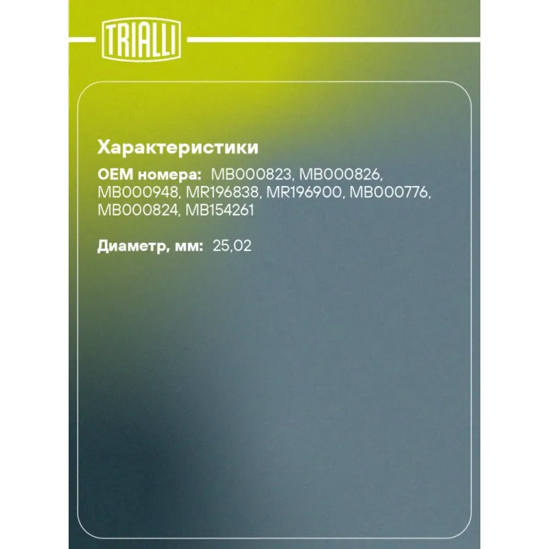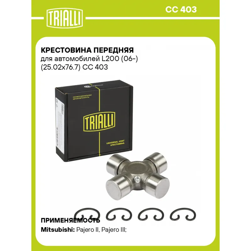 Крестовина передняя для автомобилей L200 (06-) (25.02x76.7) Характеристики: Артикул: CC 403 OEM номера: MB000823, MB000826, MB000948, MR196838, MR196900, MB000776, MB000824, MB154261 Количество на автомобиль: 1 Диаметр, мм: 25.02 Особенности конструкции:: с тавотницей H: 76.7 Гарантийный срок: 1 год/30 000 км Товарная линейка: BLACK Подходит для авто: Mitsubishi Pajero II (90-), Pajero III (00-), L200 (96-), L200 (06-), Pajero Sport (08-), Pajero II (90-), Pajero II (90-), Pajero III (00-), Pajero IV (06-), L200 (96-) Для проверки применяемости отправьте VIN автомобиля через вкладку "Есть вопросы о товаре?" Комплектация: Крестовина - 1 шт Стопорное кольцо - 4 шт Гарантия: от 1 года.