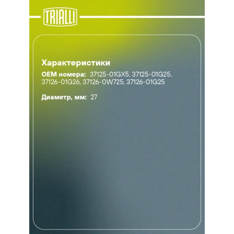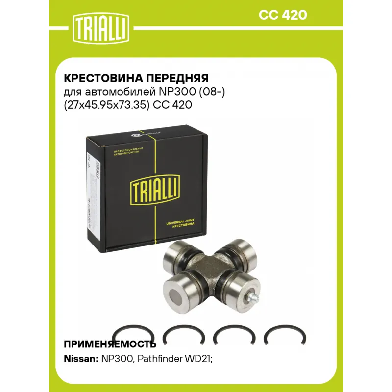 Крестовина передняя для автомобилей NP300 (08-) (27x45.95х73.35) Характеристики: Артикул: CC 420 OEM номера: 37125-01GX5, 37125-01G25, 37126-01G26, 37126-0W725, 37126-01G25 Количество на автомобиль: 1 Диаметр, мм: 27 Особенности конструкции:: с тавотницей H: 73,35 H1: 45,95 Гарантийный срок: 1 год/30 000 км Товарная линейка: BLACK Подходит для авто: Nissan NP300 (08-), Pathfinder WD21 (85-) Для проверки применяемости отправьте VIN автомобиля через вкладку "Есть вопросы о товаре?" Комплектация: Крестовина - 1 шт Стопорное кольцо - 4 шт Гарантия: от 1 года.