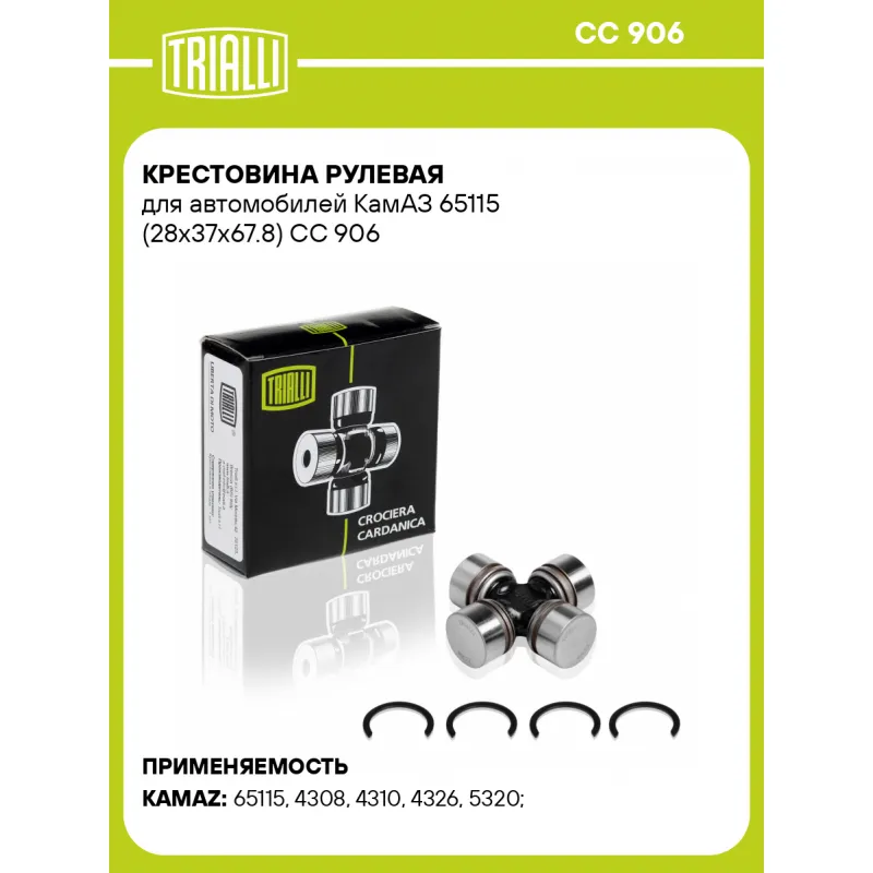 Крестовина рулевая для автомобилей КамАЗ 65115 (28x37x67.8) Характеристики: Артикул: CC 906 OEM номера: 5320-3422039 Сопутствующий товар: Крестовины: CC 617 Количество на автомобиль: 1 Диаметр, мм: 28 H: 67,8 H1: 37 Гарантийный срок: 1 год/30 000 км Товарная линейка: BLACK Подходит для авто: КамаАЗ 65115, 4308, 4310, 4326, 5320, 53212, 5410, 54112, 5511, 6540, 6522, 4350, 5350, 6350, 6520, 4308, 4308 Для проверки применяемости отправьте VIN автомобиля через вкладку "Есть вопросы о товаре?" Комплектация: Стопорное кольцо - 4 шт Крестовина - 1 шт Гарантия: от 1 года.