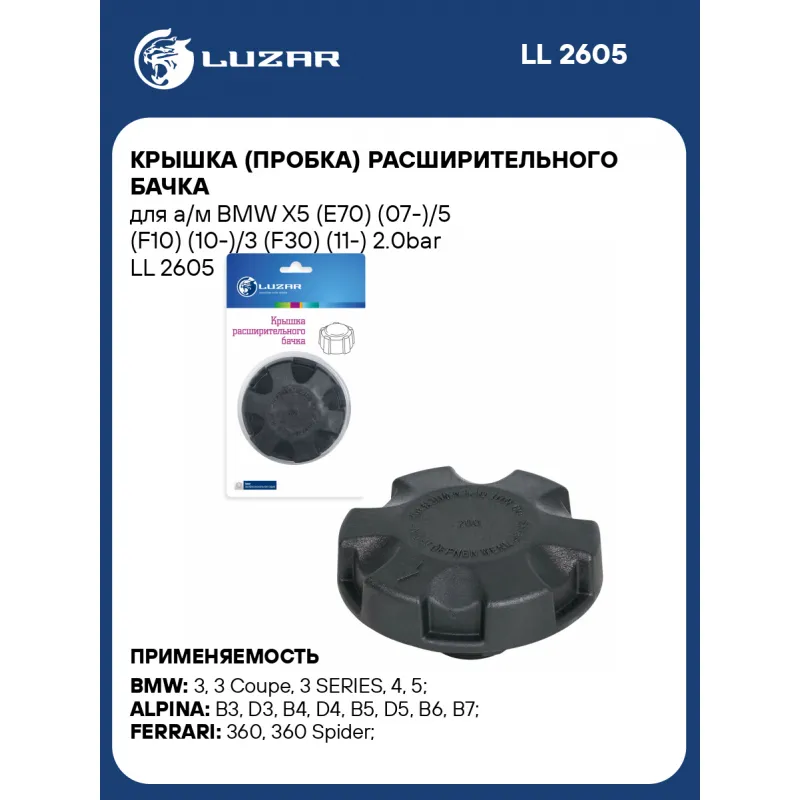 Крышка (пробка) расширительного бачка для а/м BMW X5 (E70) (07-)/5 (F10) (10-)/3 (F30) (11-) 2.0bar Характеристики: Артикул: LL 2605 OEM номера: 17137516004, 17117639021 Трансмиссия: MT/AT Кондиционер: +/- Давление, БАР: 2.0 (200кПа) Сопутствующий товар: Радиаторы охлаждения: LRc 26194; LRc 26193; LRc 2612; LRc 26113; LRc 26114;... Читать полностью →
