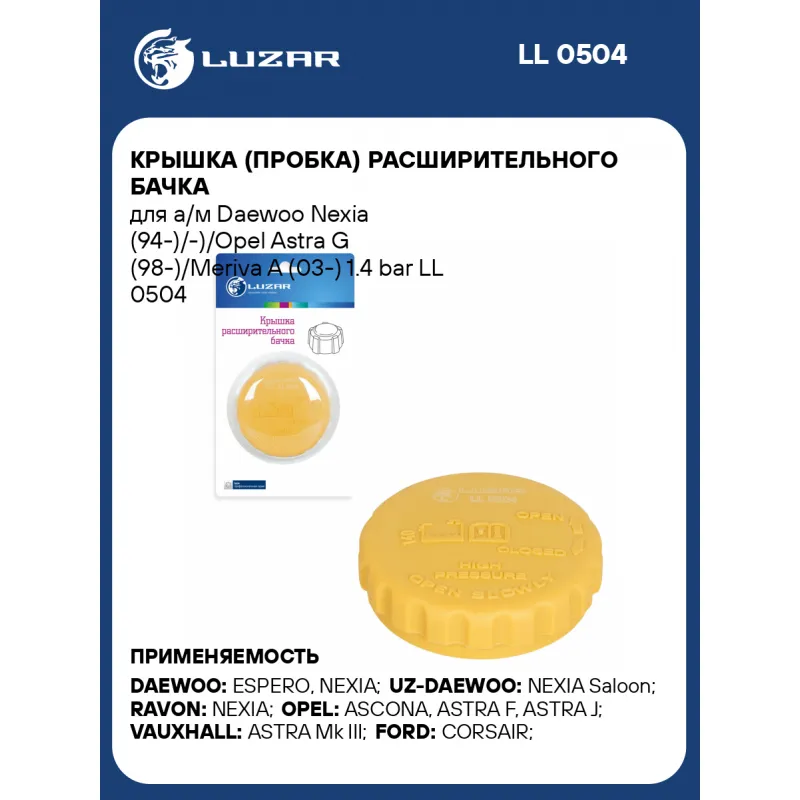 Крышка (пробка) расширительного бачка для а/м Daewoo Nexia (94-)/-)/Opel Astra G (98-)/Meriva A (03-) 1.4 bar Характеристики: Артикул: LL 0504 OEM номера: 1304666, 90467473, 90409257, 90467472 Трансмиссия: MT/AT Кондиционер: +/- Давление, БАР: 1.4 (140кПа) Сопутствующий товар: Радиаторы охлаждения: LRc DWNx94370; LRc DWNx94147; ... Читать полностью →