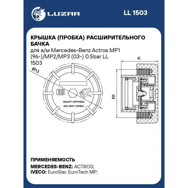 Крышка (пробка) расширительного бачка для а/м Mercedes-Benz Actros MP1 (96-)/MP2/MP3 (03-) 0.5bar Характеристики: Артикул: LL 1503 OEM номера: 93163622, A0005000206, 0005000206, A0001000050, 0001000050 Трансмиссия: MT/AT Кондиционер: +/- Давление, БАР: 0.5 (50кПа) Сопутствующий товар: Радиаторы охлаждения: LRc 1586; LRc 1588 Кол... Читать полностью →