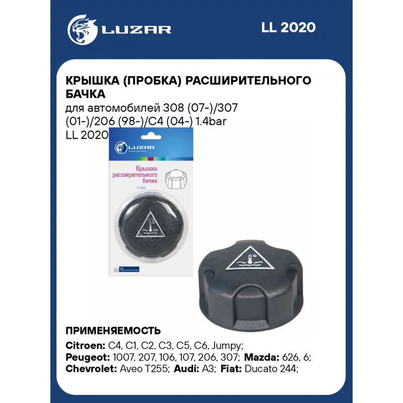 Крышка (пробка) расширительного бачка для автомобилей 308 (07-)/307 (01-)/206 (98-)/C4 (04-) 1.4bar Характеристики: Артикул: LL 2020 OEM номера: 17117639024, 17132754264, 17135A1BD89, 1306.E4, 1306.J5, 1306.C9, 9638001280, 9681593380, 16470YV011, 03637860, 3637680 Трансмиссия: MT/AT Кондиционер: +/- Давление, БАР: 1.4 (140кПа) Сопутствующий товар: Радиаторы охлаждения: LRc 20G1; LRc 2011; LRc 2009; LRc 20F4 Сопутствующий товар: Бачки расширительные: LET 2618; LET 2619; LET 2001 Количество на автомобиль: 1 Материал: пластик Цвет: черный Подходит для авто: Citroen C4 (04-), C4 (04-), C1 (05-), C2 (03-), C3 (02-), C5 (01-), C6 (05-), Jumpy (95-), Berlingo II (08-), Berlingo (00-), Jumpy (07-), DS4 (11-), DS4 (11-) Peugeot 1007 (05-), 1007 (05-), 207 (06-), 106 (96-), 107 (05-), 206 (00-), 206 (98-), 206 (98-), 307 (00-), 406 (96-), Expert (96-), 308 (07-), 308 (07-), 407 (04-), 407 (04-), 5008 (09-), 5008 (09-), 508 (11-), 607 (00-), Expert (07-), Partner (08-), 308 (07-), 508 (11-), Partner (08-) Mazda 626 (97-), 6 (02-) Chevrolet Aveo T255 (08-) Audi A3 (03-) Fiat Ducato 244 (02-) Opel Astra H (04-) Skoda Fabia II (07-) Mini Clubman (07-) Для проверки применяемости отправьте VIN автомобиля через вкладку "Есть вопросы о товаре?" Комплектация: Крышка расширительного бачка Гарантия: от 1 года.