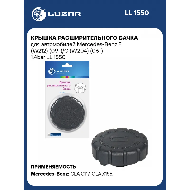 Крышка расширительного бачка для автомобилей Mercedes-Benz E (W212) (09-)/C (W204) (06-) 1.4bar Характеристики: Артикул: LL 1550 OEM номера: A2105010715, A2105010315, A2105010415, A2105010515, A2105010615, A0005018215, 2105010315, 2105010715, 2105010415, 2105010515, 2105010615, 0005018215 Давление, БАР: 1.4 (140кПа) Сопутствующий товар: Радиаторы охлаждения: LRc 15112; LRc 15114; LRc 15113 Сопутствующий товар: Бачки расширительные: LET 1511; LET 1515 Количество на автомобиль: 1 Трансмиссия: MT/AT Кондиционер: +/- Материал: пластик Цвет: черный Подходит для авто: Mercedes-Benz CLA C117 (13-), GLA X156 (13-), M-Class II (W164) (05-), M-Class III (W166) (11-), SLK R170 (96-), SLK R171 (04-), SLK R172 (11-), A-Class W176 (12-), C-Class W203 (00-), C-Class W204 (07-), C-Class W204 (07-), C-class W205 (14-), E-Class W210 (95-), E-Class W211 (02-), E-Class W211 (02-), E-Class W212 (09-), E-class W213 (16-), CL C216 (06-), CLS W218 (10-), S-Class W220 (98-), S-Class W220 (98-), S-Class W220 (98-), S-Class W221 (05-), SL-Class R231 (12-), B-Class W246 (13-), B-Class W246 (13-), R-Class (W251) (06-), GLC (15-), G W463 (90-), A-Class W177 (18-), B-Class W247 (18-), CLA C117 (13-), M-Class III (W166) (11-), SLK R172 (11-), A-Class W176 (12-), C-class W205 (14-), C-class W205 (14-), E-Class W212 (09-), E-class W213 (16-), S-Classe W222 C217 (13-), S-Class W221 (05-), B-Class W246 (13-), GLE Coupe (14-) Для проверки применяемости отправьте VIN автомобиля через вкладку "Есть вопросы о товаре?" Комплектация: Карышка расширительного бачка Гарантия: от 1 года.