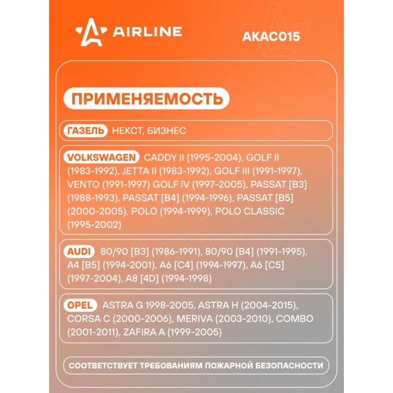 Крышка бензобака с клапаном и замком для а/м KIA/Hyundai/Газ/Daewoo/Audi/Chevrolet/Opel/Volkswagen/Suzuki/Volvo Описание: Крышка топливного бака для автомобилей ГАзель, VOLKSWAGEN, AUDI, OPEL / для бензобака с ключами AIRLINE AKAC015 Крышка надежно закрывает топливный бак, предотвращая утечку топлива из бака во время движения изолируя от внешней среды, и регулирует давление воздуха и паров внутри бака. Крышка фиксируются поворотным движением. Для изготовления крышки бака используются материалы по всем требованиям пожарной безопасности, а также способности противостоять влиянию агрессивных испарений. * Диаметр горловины - 43 мм; * Маслобензостойкая прокладка; * Соответствует требованиям пожарной безопасности; * Материал: пластик, металл, маслобензостойкая резина. * Для предотвращения пролива топлива, в случаях поломки оригинальной крышки или ее утери; * Устанавливается взамен штатной пробки бензобака. Применяемость: ГАзель Некст, Бизнес; VOLKSWAGEN (VW) Caddy II (1995-2004), Golf II (1983-1992), Jetta II (1983-1992), Golf III (1991-1997), Vento (1991-1997) Golf IV (1997-2005), Passat [B3] (1988-1993), Passat [B4] (1994-1996), Passat [B5] (2000-2005), Polo (1994-1999), Polo Classic (1995-2002); AUDI 80/90 [B3] (1986-1991), 80/90 [B4] (1991-1995), A4 [B5] (1994-2001), A6 [C4] (1994-1997), A6 [C5] (1997-2004), A8 [4D] (1994-1998); OPEL Astra G 1998-2005, Astra H (2004-2015), Corsa C (2000-2006), Meriva (2003-2010), Combo (2001-2011), Zafira A (1999-2005); В линейке AIRLINE, вы найдете широкий ассортимент высококачественных автотоваров и средств по уходу за вашим автомобилем, качественные органайзеры в автомобиль, аксессуары для автомобилей, крышки бензобака с ключами в комплекте, все для тюнинга авто, запасные крышки. Мы гарантируем качество и надежность наших товаров. Характеристики: Артикул: AKAC015 OEM номера: 191201551, 808211, 3101025000, 3101038210, 3101038600, 31010-24000, 31010-25300, 310103A901, 310103X000, 31010-4BA01, 31010C1000, 3101038500, 310101D000, 310101D200, 310102C510, 310103A910, 310104L000, 22591475, 443201129, 191201551A, 533201551F, 22591476, 90421272, 90422539, 94564508, 96351800, 96873569, 9117533 Материал корпуса: Пластик Диаметр горловины, мм: 43 Клапан: Есть Маслобензостойкая прокладка: Есть Комплектация: Крышка топливного бака - 1 шт Ключи для крышки топливного бака - 2 шт Упаковочная коробка - 1 шт Гарантия: от 1 года.