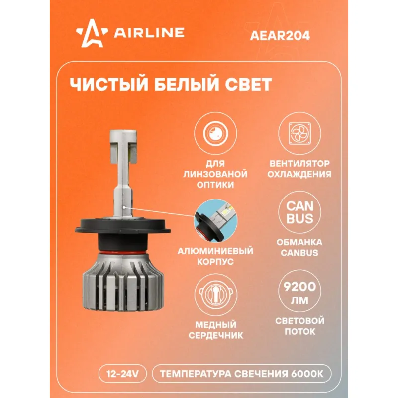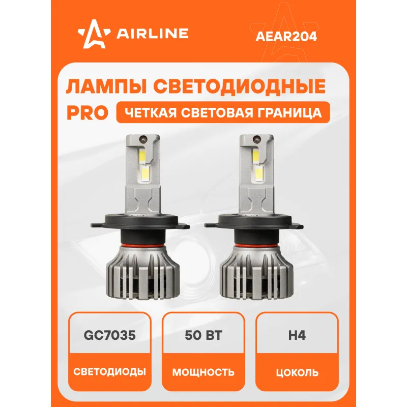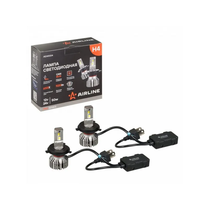 Лампа светодиодная H4 PRO, 50Вт, 9200Лм (4600Лм x 2), 6000К (Белый), 12/24В, комплект 2 шт. Описание: Лампа светодиодная 2 шт PRO 12/24В, 50 Вт, H4, 6000 К, 9200 Лм AIRLINE AEAR204. Светодиодные лампы серии PRO - это высококачественные светодиодные лампы предназначенные для установки в линзованную оптику. Лампы серии PRO обладают увеличенной мощностью и яркостью. LED лампа обладает системой активного охлаждения, состоящей из медной платы, медной теплоотводящей трубки, соединенной с алюминиевым радиатором и вентилятором. Датчик температуры предохраняет лампу от перегрева и продлевает срок службы. Внешний влагостойкий драйвер обеспечивает более равномерное рассеивание тепла. Высококачественные светодиоды GC7035 обеспечивают высокую яркость и увеличенный ресурс до 50000 часов. Светодиодные лампы имеют более высокую эффективность чем штатные. Лампа имеет возможность регулировки угла положения. Благодаря повышенной мощности, светодиодные лампы справляются с любой непогодой, будь то снег, дождь или туман. Характеристики: Артикул: AEAR204 Цоколь: H4 Тип лампы: Светодиодная Номинальная мощность, Вт: 50 Наличие обманки (CAN bus): Есть Тип обманки (CAN bus): Внешняя на проводе Температура свечения, К: 6000 Цвет свечения: Белый Яркость комплекта, Лм: 9200 Напряжение, В: 12/24 Факт. потребляемый ток, А: 3.8 Тип светодиодного чипа: GC-7035 Тип оптики: Рефлекторная/Линзованная Тип охлаждения: Радиатор; Вентилятор Регулировка положения лампы: Есть Материал корпуса: Алюминий Комплектация: Гарантийный талон - 1 шт Руководство по эксплуатации - 1 шт Лампа светодиодная - 2 шт Упаковочная коробка - 1 шт Гарантия: от 1 года.