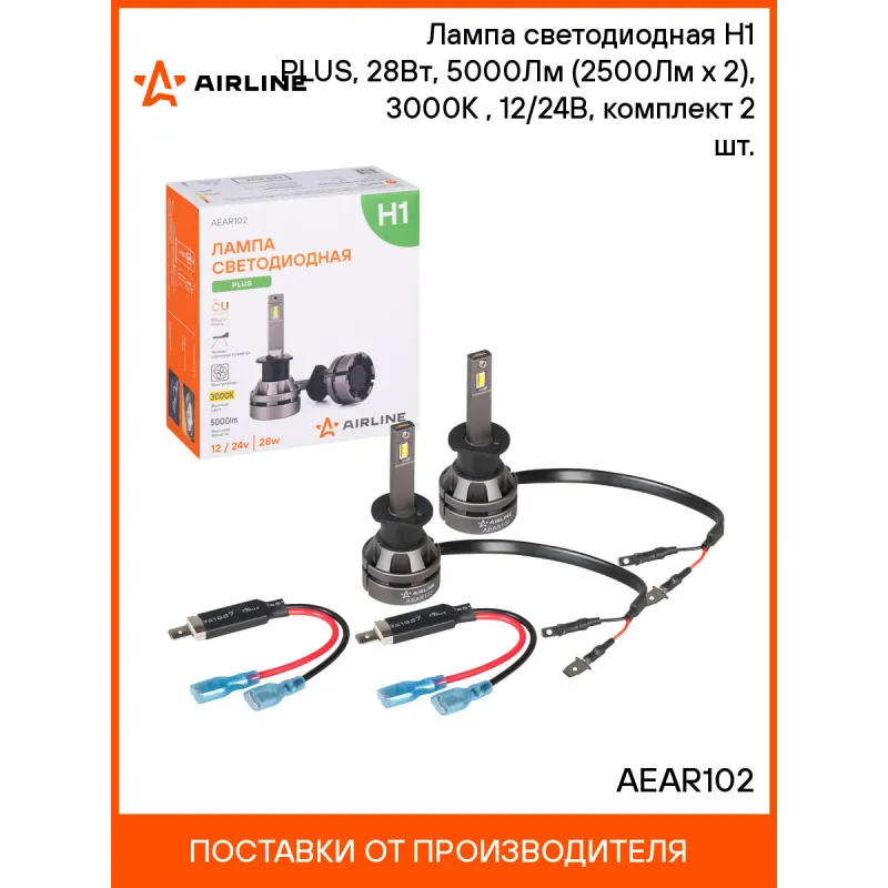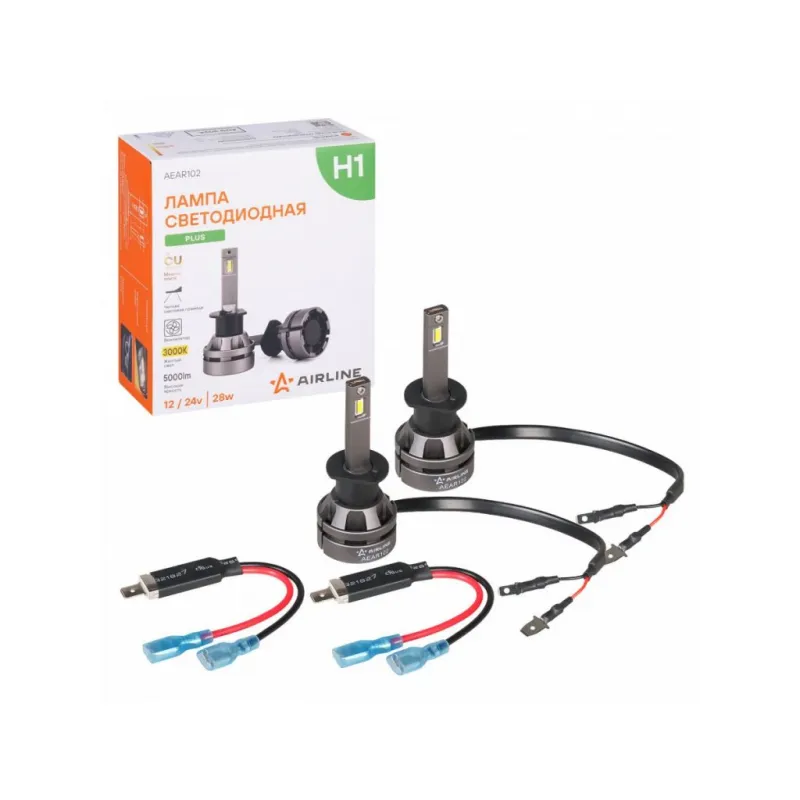 Лампа светодиодная H1 PLUS, 28Вт, 5000Лм (2500Лм x 2), 3000К (Желтый), 12/24В, комплект 2 шт. Описание: Лампа светодиодная 2 шт для рефлекторной/линзованной оптики 12/24 В, 28 Вт, H1, 3000 К, 5000 Лм AIRLINE AEAR102. Высококачественная светодиодные лампа для рефлекторной и линзованой оптики. Серия PLUS. используются как дополнительный источник света на коротких дистанциях и средних дистанциях. Лампа оснащена термоконтролем, что продлевает срок службы. Четкая светотеневая граница, благодаря тонкой медной печатной плате и светодиодам в форме нити накаливания, что позволяет использовать его в рефлекторной оптике. Линзы фокусируют свет в линию параллельную земле, с четкой световой границей. Правильно установленная лампа не слепит. Мощность каждой лампы 12/24 В. Высококачественные светодиоды обеспечивают высокую яркость и увеличенный ресурс до 50000 часов. Электрическая схема разработана с ограничением тока, защитой от обратного напряжения. Светодиодные лампы имеют более низкое энергопотребление чем штатные, что не создает дополнительной нагрузки на электросеть автомобиля. Алюминиевый корпус с вентилятором и теплопроводящая печатная плата с термоинтерфейсом отлично охлаждают светодиоды, продлевая срок службы изделия. Лампа имеет возможность регулировки угла положения. Цоколь H1. Цвет Желтый. Место расположения: ближний/дальний свет. Использование устройств не предназначено для дорог общего пользования. Характеристики: Артикул: AEAR102 Цоколь: H1 Тип лампы: Светодиодная Номинальная мощность, Вт: 28 Температура свечения, К: 3000 Цвет свечения: Желтый Яркость комплекта, Лм: 5000 Напряжение, В: 12/24 Факт. потребляемый ток, А: 1.6 Тип светодиодного чипа: GC-1860 Тип оптики: Рефлекторная/Линзованная Тип охлаждения: Радиатор; Вентилятор Регулировка положения лампы: Есть Материал корпуса: Алюминий Комплектация: Лампа светодиодная - 2 шт Провода подключения - 2 шт Руководство по эксплуатации - 1 шт Гарантийный талон - 1 шт Упаковочная коробка - 1 шт Гарантия: от 1 года.