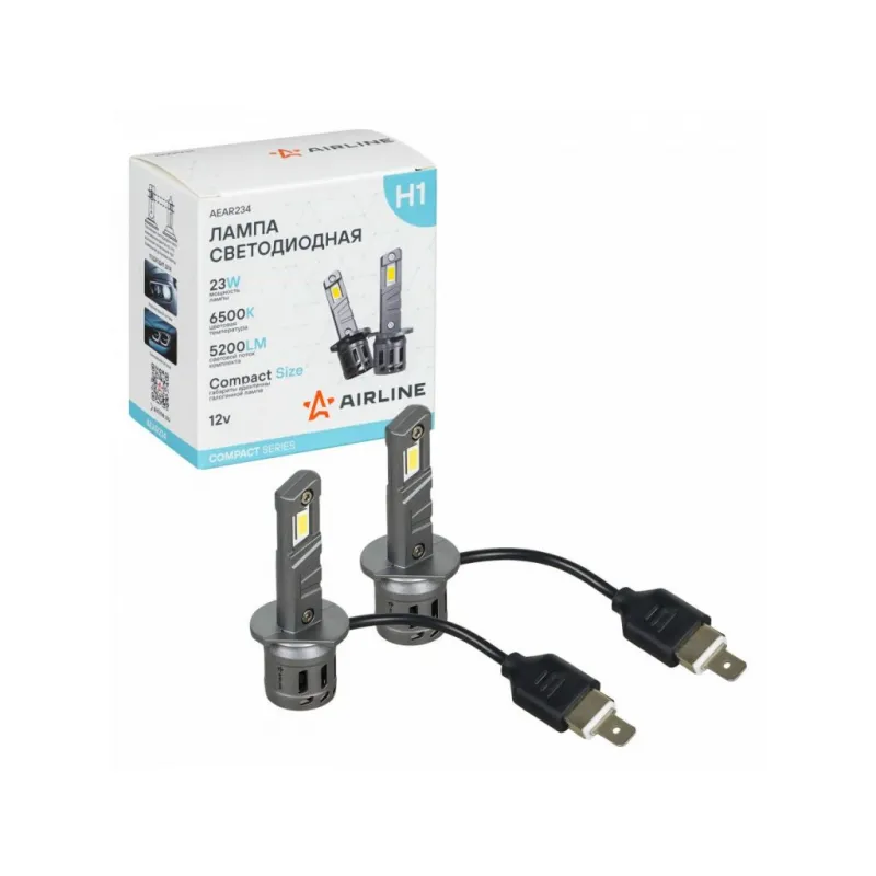 Лампа светодиодная H1 COMPACT, 23Вт, 5200Лм (2600Лм x 2), 6500K (Белый), 12В, комплект 2 шт. Описание: LED лампы AIRLINE AEAR234 с цоколем H1 предназначены для рефлекторной и линзованной оптики, формируют четкую светотеневую границу, направляя световой поток на дорожное полотно и исключая ослепление встречных водителей, что повышает безопасность эксплуатации. Компактные размеры корпуса, аналогичные галогенным лампам, обеспечивают удобную установку без необходимости использования дополнительных адаптеров или замены крышек фар. Мощность одной LED лампы – 23Вт, напряжение – 12В. Яркость комплекта из двух LED ламп – 5200Лм, цветовая температура 6500К обеспечивает яркий белый свет, приближенный к дневному. В отличие от галогенных аналогов, светодиодные лампы потребляют меньше энергии, что снижает нагрузку на электросеть автомобиля и способствует её стабильной работе. Комбинированная система охлаждения, включающая пассивный радиатор и встроенный высокоэффективный вентилятор, обеспечивает надежный отвод тепла от светодиодов и предотвращает их перегрев. Алюминиевый корпус устойчив к коррозии и механическим воздействиям, дополнительно рассеивает тепло и продлевает срок службы ламп. Устройства не предназначены для использования на дорогах общего пользования. Автосвет AIRLINE – надежное освещение для уверенной поездки в любых условиях. Характеристики: Артикул: AEAR234 Цоколь: H1 Тип лампы: Светодиодная Номинальная мощность, Вт: 23 Температура свечения, К: 6500 Цвет свечения: Белый Яркость комплекта, Лм: 5200 Напряжение, В: 12 Факт. потребляемый ток, А: 2.2 Тип светодиодного чипа: GC-7535 Тип оптики: Рефлекторная/Линзованная Тип охлаждения: Радиатор; Вентилятор Материал корпуса: Алюминий Комплектация: Лампа светодиодная - 2 шт Руководство по эксплуатации - 1 шт Упаковочная коробка - 1 шт Гарантийный талон - 1 шт Гарантия: от 1 года.