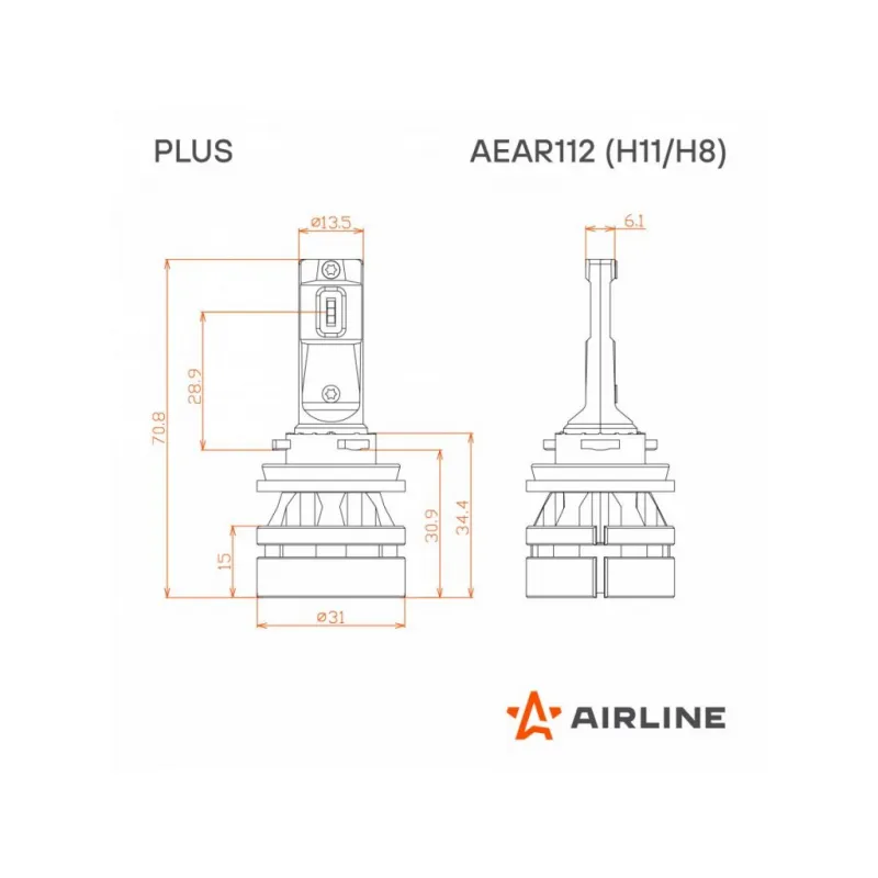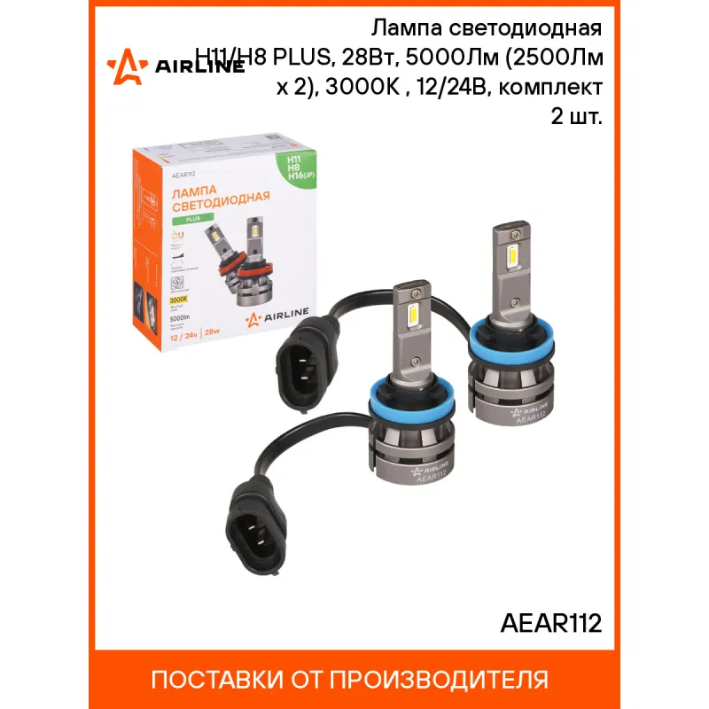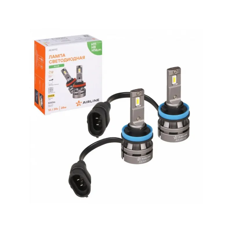 Лампа светодиодная H11/H8 PLUS, 28Вт, 5000Лм (2500Лм x 2), 3000К (Желтый), 12/24В, комплект 2 шт. Описание: Лампа светодиодная 2 шт для рефлекторной/линзованной оптики 12/24 В, 28 Вт, H11/H8, 3000 К, 5000 Лм AIRLINE AEAR112. Высококачественная светодиодные лампа для рефлекторной и линзованой оптики. Серия PLUS. используются как дополнительный источник света на коротких дистанциях и средних дистанциях. Лампа оснащена термоконтролем, что продлевает срок службы. Четкая светотеневая граница, благодаря тонкой медной печатной плате и светодиодам в форме нити накаливания, что позволяет использовать его в рефлекторной оптике. Линзы фокусируют свет в линию параллельную земле, с четкой световой границей. Правильно установленная лампа не слепит. Мощность каждой лампы 28 Вт. Высококачественные светодиоды GC обеспечивают высокую яркость и увеличенный ресурс до 50000 часов. Электрическая схема разработана с ограничением тока, защитой от обратного напряжения. Светодиодные лампы имеют более низкое энергопотребление чем штатные, что не создает дополнительной нагрузки на электросеть автомобиля. Алюминиевый корпус с вентилятором и теплопроводящая печатная плата с термоинтерфейсом отлично охлаждают светодиоды, продлевая срок службы изделия. Лампа имеет возможность регулировки угла положения. Место расположения: ПТФ. Цоколь H11/H8. Цвет Желтый. Использование устройств не предназначено для дорог общего пользования. Характеристики: Артикул: AEAR112 Цоколь: H11/H8 Тип лампы: Светодиодная Номинальная мощность, Вт: 28 Температура свечения, К: 3000 Цвет свечения: Желтый Яркость комплекта, Лм: 5000 Напряжение, В: 12/24 Факт. потребляемый ток, А: 2.1 Тип светодиодного чипа: GC-1860 Тип оптики: Рефлекторная/Линзованная Тип охлаждения: Радиатор; Вентилятор Регулировка положения лампы: Есть Материал корпуса: Алюминий Комплектация: Лампа светодиодная - 2 шт Руководство по эксплуатации - 1 шт Гарантийный талон - 1 шт Упаковочная коробка - 1 шт Гарантия: от 1 года.