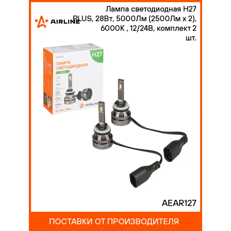 Лампа светодиодная H27 PLUS, 28Вт, 5000Лм (2500Лм x 2), 6000К (Белый), 12/24В, комплект 2 шт. Описание: Лампа светодиодная 2 шт для рефлекторной/линзованной оптики 12/24 В, 28 Вт, H27, 6500 К, 5000 Лм AIRLINE AEAR127. Высококачественная светодиодные лампа для рефлекторной и линзованой оптики. Серия PLUS. используются как дополнительный источник света на коротких дистанциях и средних дистанциях. Лампа оснащена термоконтролем, что продлевает срок службы. Четкая светотеневая граница, благодаря тонкой медной печатной плате и светодиодам в форме нити накаливания, что позволяет использовать его в рефлекторной оптике. Линзы фокусируют свет в линию параллельную земле, с четкой световой границей. Правильно установленная лампа не слепит. Мощность каждой лампы 28 Вт. Высококачественные светодиоды GC обеспечивают высокую яркость и увеличенный ресурс до 50000 часов. Электрическая схема разработана с ограничением тока, защитой от обратного напряжения. Светодиодные лампы имеют более низкое энергопотребление чем штатные, что не создает дополнительной нагрузки на электросеть автомобиля. Алюминиевый корпус с вентилятором и теплопроводящая печатная плата с термоинтерфейсом отлично охлаждают светодиоды, продлевая срок службы изделия. Лампа имеет возможность регулировки угла положения. Место расположения: ПТФ. Цоколь H27. Цвет Белый. Использование устройств не предназначено для дорог общего пользования. Характеристики: Артикул: AEAR127 Цоколь: H27 Тип лампы: Светодиодная Номинальная мощность, Вт: 28 Температура свечения, К: 6500 Цвет свечения: Белый Яркость комплекта, Лм: 5000 Напряжение, В: 12/24 Факт. потребляемый ток, А: 1.6 Тип светодиодного чипа: GC-1860 Тип оптики: Рефлекторная/Линзованная Тип охлаждения: Радиатор; Вентилятор Регулировка положения лампы: Есть Материал корпуса: Алюминий Комплектация: Лампа светодиодная - 2 шт Руководство по эксплуатации - 1 шт Гарантийный талон - 1 шт Упаковочная коробка - 1 шт Гарантия: от 1 года.