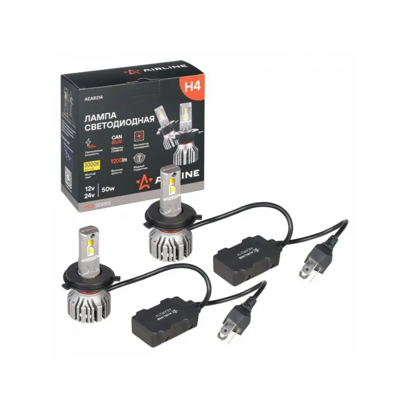 Лампа светодиодная H4 PRO, 50Вт, 9200Лм (4600Лм x 2), 3000К (Желтый), 12/24В, комплект 2 шт. Описание: Лампа светодиодная 2 шт PRO для линзованной оптики 12/24 В, 50 Вт, H4, 3000 К, 9200 Лм AIRLINE AEAR214. Светодиодные лампы серии PRO - это высококачественные светодиодные лампы предназначенные для установки в линзованную оптику. Лампы серии PRO обладают увеличенной мощностью и яркостью. LED лампа обладает системой активного охлаждения, состоящей из медной платы, медной теплоотводящей трубки, соединенной с алюминиевым радиатором и вентилятором. Датчик температуры предохраняет лампу от перегрева и продлевает срок службы. Внешний влагостойкий драйвер обеспечивает более равномерное рассеивание тепла. Высококачественные светодиоды обеспечивают высокую яркость и увеличенный ресурс до 50000 часов. Светодиодные лампы имеют более высокую эффективность чем штатные. Лампа имеет возможность регулировки угла положения. Характеристики: Артикул: AEAR214 Цоколь: H4 Тип лампы: Светодиодная Номинальная мощность, Вт: 50 Наличие обманки (CAN bus): Есть Тип обманки (CAN bus): Внешняя на проводе Температура свечения, К: 3000 Цвет свечения: Желтый Яркость комплекта, Лм: 9200 Напряжение, В: 12/24 Факт. потребляемый ток, А: 3.8 Тип светодиодного чипа: GC-7035 Тип оптики: Рефлекторная/Линзованная Тип охлаждения: Радиатор; Вентилятор Регулировка положения лампы: Есть Материал корпуса: Алюминий Комплектация: Лампа светодиодная - 2 шт Руководство по эксплуатации - 1 шт Гарантийный талон - 1 шт Упаковочная коробка - 1 шт Гарантия: от 1 года.