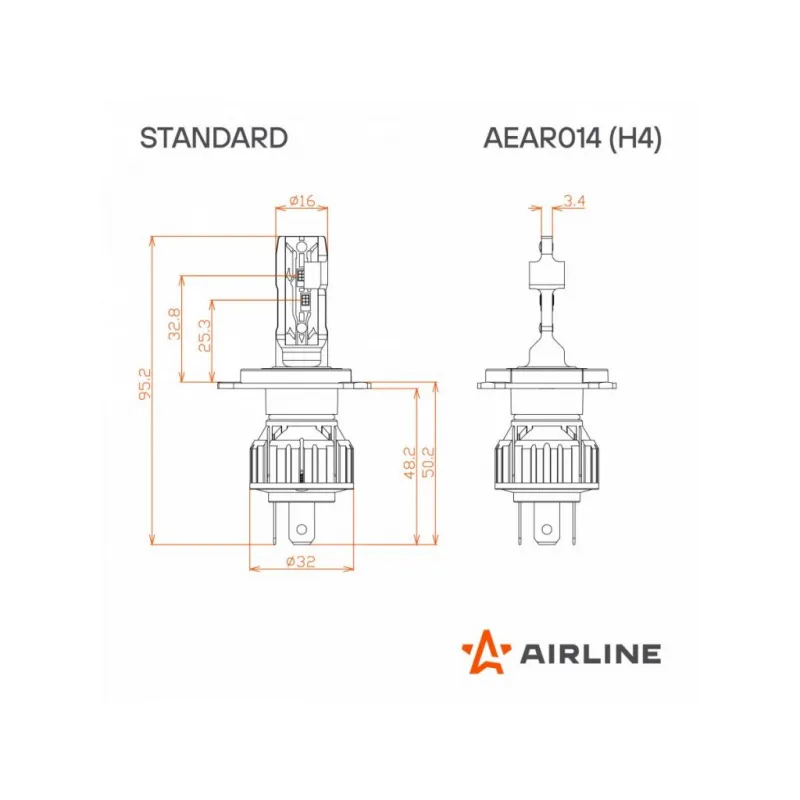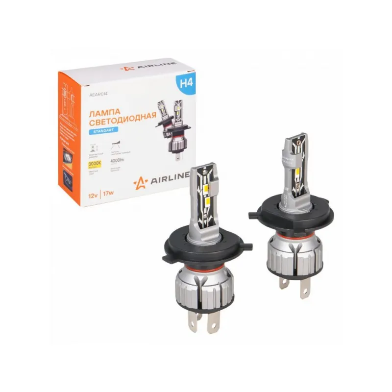 Лампа светодиодная H4 STANDARD, 17Вт, 4000Лм (2000Лм x 2), 3000К (Желтый), 12В, комплект 2 шт. Описание: Лампа светодиодная 2 шт для рефлекторной/линзованной оптики 12 В, 17 Вт, H4, 3000 К, 4000 Лм AIRLINE AEAR014. Линейка компактных светодиодных ламп. Светодиодные лампа для рефлекторной и линзованой оптики. Четкая светотеневая граница, благодаря тонкой печатной плате и светодиодам в форме нити накаливания. что позволяет использовать его в рефлекторной оптике. Правильно установленная лампа не слепит. Плоский радиатор позволяет установить лампу в любую фару, без необходимости покупки увеличенной крышки фары. Мощность каждой лампы 12 В. Высококачественные светодиоды обеспечивают высокую яркость и увеличенный ресурс до 30000 часов. Светодиодные лампы имеют более низкое энергопотребление чем штатные (в 3 раза), что не создавая дополнительной нагрузки на электросеть автомобиля. Алюминиевый корпус с объемным радиатором и теплопроводящая печатная плата- отлично охлаждают светодиоды, продлевая срок службы изделия. Корпус из авиационного алюминия 6063. Лампа имеет возможность регулировки угла положения. Цоколь H4. Цвет Желтый. Место расположения: ближний/дальний. Использование устройств не предназначено для дорог общего пользования. Характеристики: Артикул: AEAR014 Цоколь: H4 Тип лампы: Светодиодная Номинальная мощность, Вт: 17 Температура свечения, К: 3000 Цвет свечения: Желтый Яркость комплекта, Лм: 4000 Тип оптики: Рефлекторная/Линзованная Напряжение, В: 12 Факт. потребляемый ток, А: 1.3 Тип светодиодного чипа: CSP 5530 Тип охлаждения: Радиатор Регулировка положения лампы: Есть Материал корпуса: Алюминий Комплектация: Лампа светодиодная - 2 шт Руководство по эксплуатации - 1 шт Гарантийный талон - 1 шт Упаковочная коробка - 1 шт Гарантия: от 1 года.