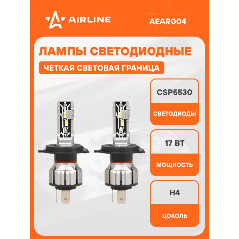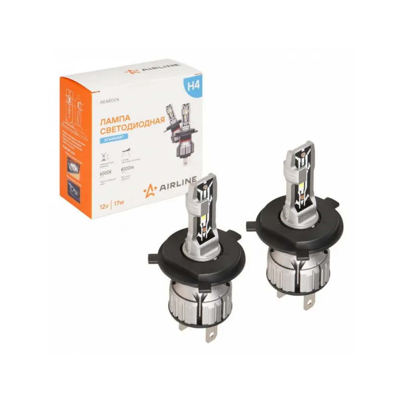 Лампа светодиодная H4 STANDARD, 17Вт, 4000Лм (2000Лм x 2), 6000К (Белый), 12В, комплект 2 шт. Описание: Лампа светодиодная, комплект 2 шт, STANDART 12В, 17 Вт, H4, 6000 К, 4000 Лм от бренда AIRLINE AEAR004. Светодиодные лампа для рефлекторной и линзованой оптики. * Четкая светотеневая граница, благодаря тонкой печатной плате и светодиодам в форме нити накаливания. что позволяет использовать его в рефлекторной оптике. Правильно установленная лампа не слепит. * Плоский радиатор позволяет установить лампу в любую фару, без необходимости покупки увеличенной крышки фары. Мощность каждой лампы 17 Вт. Высококачественные светодиоды CSP 5530 обеспечивают высокую яркость и увеличенный ресурс до 30000 часов. Светодиодные лампы имеют более низкое энергопотребление чем штатные (в 3 раза), что не создавая дополнительной нагрузки на электросеть автомобиля. Алюминиевый корпус с объемным радиатором и теплопроводящая печатная плата- отлично охлаждают светодиоды, продлевая срок службы изделия. Корпус из авиационного алюминия 6063. Лампа имеет возможность регулировки угла положения. Цоколь H4. Цвет Белый. Использование устройств не предназначено для дорог общего пользования. Лампы могут быть установлены в ближний и дальний свет. Благодаря повышенной мощности, светодиодные лампы справляются с любой непогодой, будь то снег, дождь или туман. Характеристики: Артикул: AEAR004 Цоколь: H4 Тип лампы: Светодиодная Номинальная мощность, Вт: 17 Температура свечения, К: 6000 Цвет свечения: Белый Яркость комплекта, Лм: 4000 Напряжение, В: 12 Факт. потребляемый ток, А: 1.3 Тип светодиодного чипа: CSP 5530 Тип оптики: Рефлекторная/Линзованная Тип охлаждения: Радиатор Регулировка положения лампы: Есть Материал корпуса: Алюминий Комплектация: Лампа светодиодная - 2 шт Руководство по эксплуатации - 1 шт Гарантийный талон - 1 шт Упаковочная коробка - 1 шт Гарантия: от 1 года.