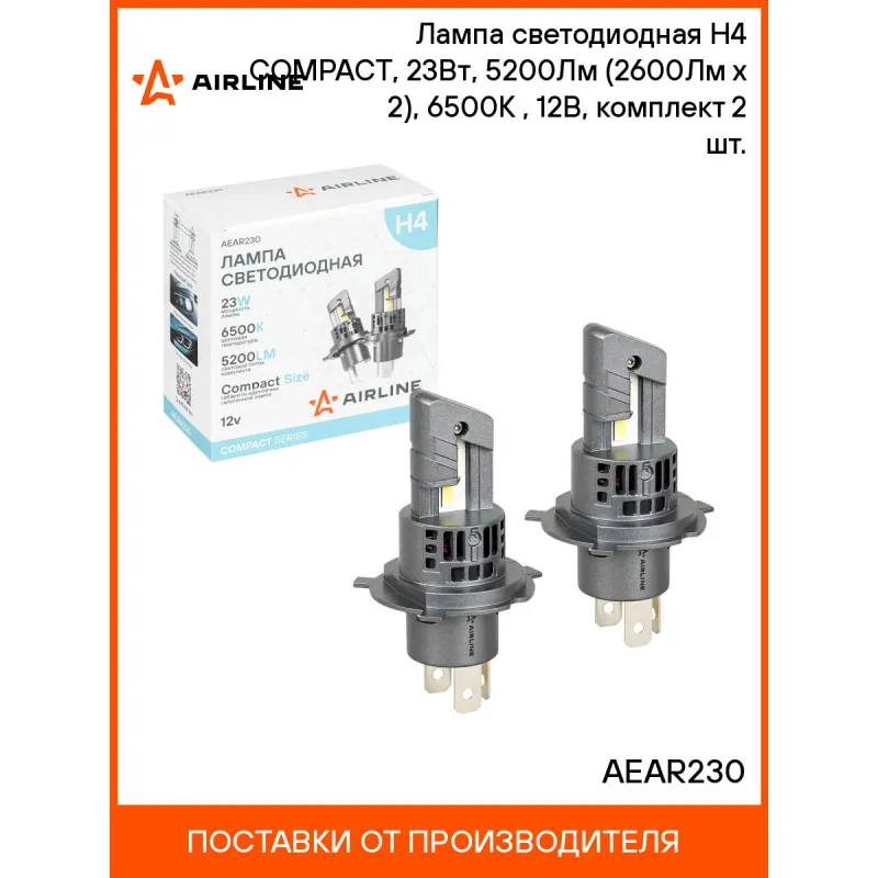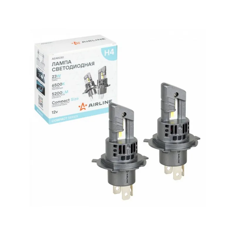Лампа светодиодная H4 COMPACT, 23Вт, 5200Лм (2600Лм x 2), 6500К (Белый), 12В, комплект 2 шт. Описание: LED лампы AIRLINE AEAR230 с цоколем H4 предназначены для рефлекторной и линзованной оптики, формируют четкую светотеневую границу, направляя световой поток на дорожное полотно и исключая ослепление встречных водителей, что повышает безопасность эксплуатации. Компактные размеры корпуса, аналогичные галогенным лампам, обеспечивают удобную установку без необходимости использования дополнительных адаптеров или замены крышек фар. Мощность одной LED лампы – 23Вт, напряжение – 12В. Яркость комплекта из двух LED ламп – 5200Лм, цветовая температура 6500К обеспечивает яркий белый свет, приближенный к дневному. В отличие от галогенных аналогов, светодиодные лампы потребляют меньше энергии, что снижает нагрузку на электросеть автомобиля и способствует её стабильной работе. Комбинированная система охлаждения, включающая пассивный радиатор и встроенный высокоэффективный вентилятор, обеспечивает надежный отвод тепла от светодиодов и предотвращает их перегрев. Алюминиевый корпус устойчив к коррозии и механическим воздействиям, дополнительно рассеивает тепло и продлевает срок службы ламп. LED лампы предназначены для установки в дальний и ближний свет. Устройства не предназначены для использования на дорогах общего пользования. Автосвет AIRLINE – надежное освещение для уверенной поездки в любых условиях. Характеристики: Артикул: AEAR230 Цоколь: H4 Тип лампы: Светодиодная Номинальная мощность, Вт: 23 Температура свечения, К: 6500 Цвет свечения: Белый Яркость комплекта, Лм: 5200 Напряжение, В: 12 Факт. потребляемый ток, А: 2.2 Тип светодиодного чипа: GC-7535 Тип оптики: Рефлекторная/Линзованная Тип охлаждения: Радиатор; Вентилятор Материал корпуса: Алюминий Комплектация: Руководство по эксплуатации - 1 шт Лампа светодиодная - 2 шт Упаковочная коробка - 1 шт Гарантийный талон - 1 шт Гарантия: от 1 года.