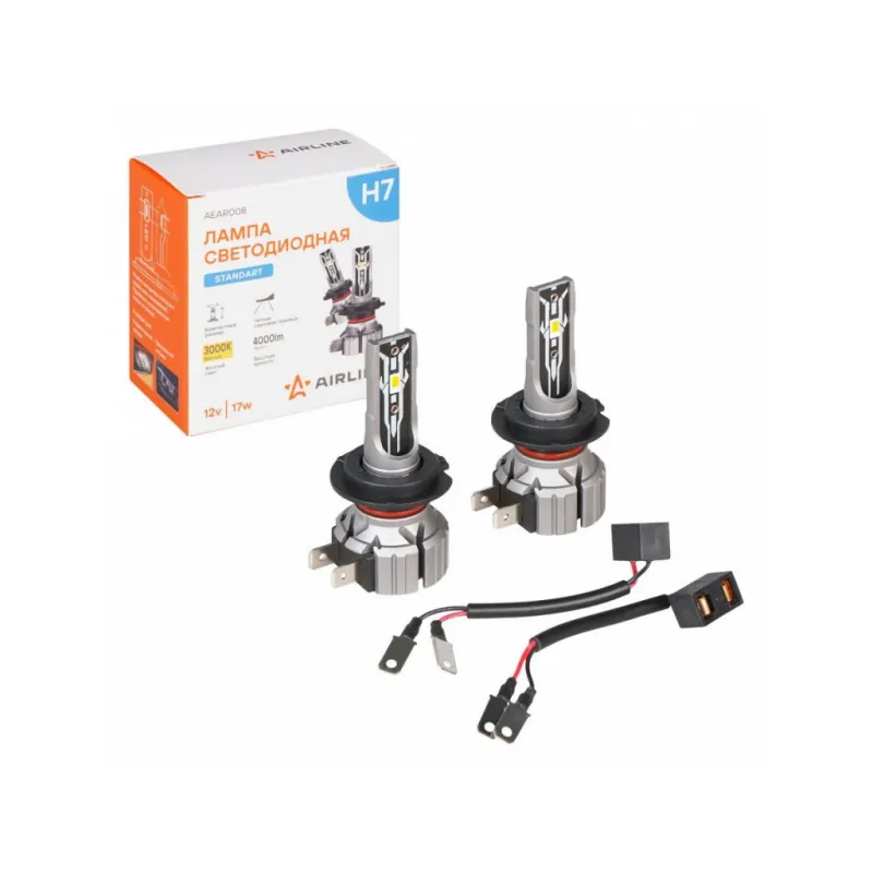 Лампа светодиодная H7 STANDARD, 17Вт, 4000Лм (2000Лм x 2), 3000К (Желтый), 12В, комплект 2 шт. Описание: Лампа светодиодная 2 шт для рефлекторной/линзованной оптики 12 В, 17 Вт, H7, 3000 К, 4000 Лм AIRLINE AEAR008. Линейка компактных светодиодных ламп. Светодиодные лампа для рефлекторной и линзованой оптики. Четкая светотеневая граница, благодаря тонкой печатной плате и светодиодам в форме нити накаливания. что позволяет использовать его в рефлекторной оптике. Правильно установленная лампа не слепит. Плоский радиатор позволяет установить лампу в любую фару, без необходимости покупки увеличенной крышки фары. Мощность каждой лампы 12 В. Высококачественные светодиоды обеспечивают высокую яркость и увеличенный ресурс до 30000 часов. Светодиодные лампы имеют более низкое энергопотребление чем штатные (в 3 раза), что не создавая дополнительной нагрузки на электросеть автомобиля. Алюминиевый корпус с объемным радиатором и теплопроводящая печатная плата- отлично охлаждают светодиоды, продлевая срок службы изделия. Корпус из авиационного алюминия 6063. Лампа имеет возможность регулировки угла положения. Цоколь H7. Цвет Желтый. Место расположения: ближний/птф. Использование устройств не предназначено для дорог общего пользования. Характеристики: Артикул: AEAR008 Цоколь: H7 Тип лампы: Светодиодная Номинальная мощность, Вт: 17 Температура свечения, К: 3000 Цвет свечения: Желтый Яркость комплекта, Лм: 4000 Напряжение, В: 12 Факт. потребляемый ток, А: 1.3 Тип светодиодного чипа: CSP 5530 Тип оптики: Рефлекторная/Линзованная Тип охлаждения: Радиатор Регулировка положения лампы: Есть Материал корпуса: Алюминий Комплектация: Лампа светодиодная - 2 шт Руководство по эксплуатации - 1 шт Гарантийный талон - 1 шт Упаковочная коробка - 1 шт Гарантия: от 1 года.