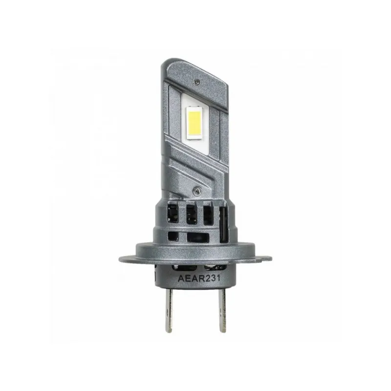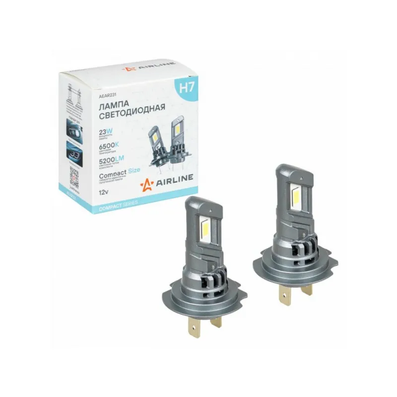 Лампа светодиодная H7 COMPACT, 23Вт, 5200Лм (2600Лм x 2), 6500К (Белый), 12В, комплект 2 шт. Описание: LED лампы AIRLINE AEAR231 с цоколем H7 предназначены для рефлекторной и линзованной оптики, формируют четкую светотеневую границу, направляя световой поток на дорожное полотно и исключая ослепление встречных водителей, что повышает безопасность эксплуатации. Компактные размеры корпуса, аналогичные галогенным лампам, обеспечивают удобную установку без необходимости использования дополнительных адаптеров или замены крышек фар. Мощность одной LED лампы – 23Вт, напряжение – 12В. Яркость комплекта из двух LED ламп – 5200Лм, цветовая температура 6500К обеспечивает яркий белый свет, приближенный к дневному. В отличие от галогенных аналогов, светодиодные лампы потребляют меньше энергии, что снижает нагрузку на электросеть автомобиля и способствует её стабильной работе. Комбинированная система охлаждения, включающая пассивный радиатор и встроенный высокоэффективный вентилятор, обеспечивает надежный отвод тепла от светодиодов и предотвращает их перегрев. Алюминиевый корпус устойчив к коррозии и механическим воздействиям, дополнительно рассеивает тепло и продлевает срок службы ламп. LED лампы предназначены для установки в дальний и ближний свет, а также в противотуманные фары. Устройства не предназначены для использования на дорогах общего пользования. Автосвет AIRLINE – надежное освещение для уверенной поездки в любых условиях. Характеристики: Артикул: AEAR231 Цоколь: H7 Тип лампы: Светодиодная Номинальная мощность, Вт: 23 Температура свечения, К: 6500 Цвет свечения: Белый Яркость комплекта, Лм: 5200 Напряжение, В: 12 Факт. потребляемый ток, А: 2.2 Тип светодиодного чипа: GC-7535 Тип оптики: Рефлекторная/Линзованная Тип охлаждения: Радиатор; Вентилятор Материал корпуса: Алюминий Комплектация: Руководство по эксплуатации - 1 шт Гарантийный талон - 1 шт Лампа светодиодная - 2 шт Упаковочная коробка - 1 шт Гарантия: от 1 года.