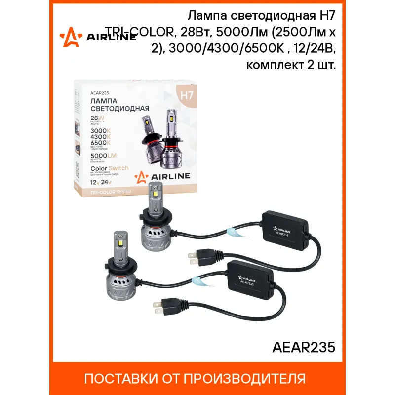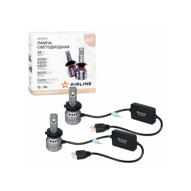 Лампа светодиодная H7 TRI-COLOR, 28Вт, 5000Лм (2500Лм x 2), 3000/4300/6500K (Белый/Желтый), 12/24В, комплект 2 шт. Описание: LED лампы AIRLINE AEAR235 с цоколем H7 предназначены для рефлекторной и линзованной оптики, формируют четкую светотеневую границу, направляя световой поток на дорожное полотно и исключая ослепление встречных водителей, что повышает безопасность эксплуатации. Модель оснащена функцией переключения между тремя режимами цветовой температуры: – 3000К – жёлтый свет с высокой проникающей способностью; – 4300К – нейтральный белый свет; – 6500К – холодный белый свет, приближённый к дневному. Переключение режимов осуществляется последовательным включением и выключением лампы. Мощность одной LED лампы – 28Вт, напряжение – 12/24В, яркость комплекта из двух LED ламп – 5000Лм. В отличие от галогенных аналогов, светодиодные лампы потребляют меньше энергии, что снижает нагрузку на электросеть автомобиля и способствует её стабильной работе. Комбинированная система охлаждения, включающая пассивный радиатор и встроенный высокоэффективный вентилятор, обеспечивает надежный отвод тепла от светодиодов и предотвращает их перегрев. Алюминиевый корпус устойчив к коррозии и механическим воздействиям, дополнительно рассеивает тепло и продлевает срок службы ламп. Возможность регулировки угла положения ламп обеспечивает точную настройку светового потока для оптимального освещения. LED лампы предназначены для установки в дальний и ближний свет, а также в противотуманные фары. Устройства не предназначены для использования на дорогах общего пользования. Автосвет AIRLINE – надежное освещение для уверенной поездки в любых условиях. Характеристики: Артикул: AEAR235 Цоколь: H7 Тип лампы: Светодиодная Номинальная мощность, Вт: 28 Температура свечения, К: 3000/4300/6500 Цвет свечения: Белый/Желтый Яркость комплекта, Лм: 5000 Напряжение, В: 12/24 Факт. потребляемый ток, А: 2.3 Тип светодиодного чипа: 4PCS-GC Тип оптики: Рефлекторная/Линзованная Тип охлаждения: Радиатор; Вентилятор Регулировка положения лампы: Есть Материал корпуса: Алюминий Комплектация: Гарантийный талон - 1 шт Лампа светодиодная - 2 шт Руководство по эксплуатации - 1 шт Упаковочная коробка - 1 шт Гарантия: от 1 года.