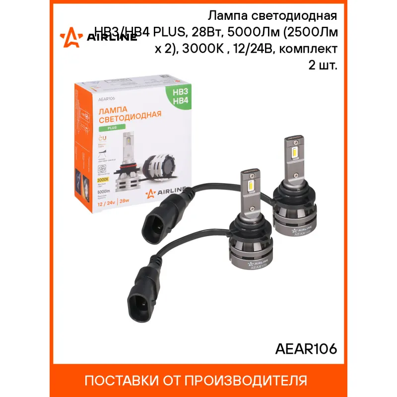 Лампа светодиодная HB3/HB4 PLUS, 28Вт, 5000Лм (2500Лм x 2), 3000К (Желтый), 12/24В, комплект 2 шт. Описание: Лампа светодиодная 2 шт для рефлекторной/линзованной оптики 12/24 В, 28 Вт, HB3/HB4, 3000 К, 5000 Лм AIRLINE AEAR106. Высококачественная светодиодные лампа для рефлекторной и линзованой оптики. Серия PLUS. используются как дополнительный источник света на коротких дистанциях и средних дистанциях. Лампа оснащена термоконтролем, что продлевает срок службы. Четкая светотеневая граница, благодаря тонкой медной печатной плате и светодиодам в форме нити накаливания, что позволяет использовать его в рефлекторной оптике. Линзы фокусируют свет в линию параллельную земле, с четкой световой границей. Правильно установленная лампа не слепит. Мощность каждой лампы 12/24 В. Высококачественные светодиоды обеспечивают высокую яркость и увеличенный ресурс до 50000 часов. Электрическая схема разработана с ограничением тока, защитой от обратного напряжения. Светодиодные лампы имеют более низкое энергопотребление чем штатные, что не создает дополнительной нагрузки на электросеть автомобиля. Алюминиевый корпус с вентилятором и теплопроводящая печатная плата с термоинтерфейсом отлично охлаждают светодиоды, продлевая срок службы изделия. Лампа имеет возможность регулировки угла положения. Цоколь HB3/HB4. Цвет Желтый. Место расположения: ближний/дальний свет. Использование устройств не предназначено для дорог общего пользования. Характеристики: Артикул: AEAR106 Цоколь: HB3/HB4 Тип лампы: Светодиодная Номинальная мощность, Вт: 28 Температура свечения, К: 3000 Цвет свечения: Желтый Яркость комплекта, Лм: 5000 Напряжение, В: 12/24 Факт. потребляемый ток, А: 2.1 Тип светодиодного чипа: GC-1860 Тип оптики: Рефлекторная/Линзованная Тип охлаждения: Радиатор; Вентилятор Регулировка положения лампы: Есть Материал корпуса: Алюминий Комплектация: Лампа светодиодная - 2 шт Руководство по эксплуатации - 1 шт Гарантийный талон - 1 шт Упаковочная коробка - 1 шт Гарантия: от 1 года.