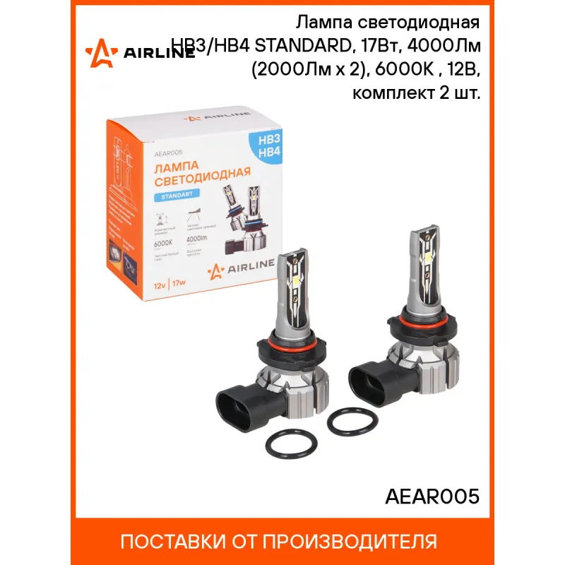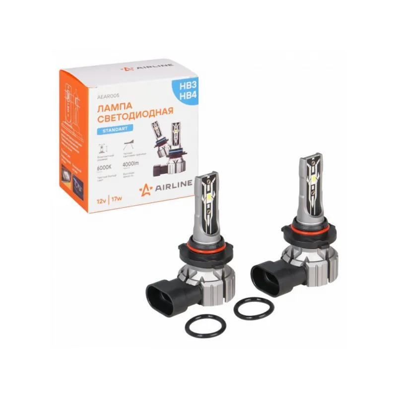 Лампа светодиодная HB3/HB4 STANDARD, 17Вт, 4000Лм (2000Лм x 2), 6000К (Белый), 12В, комплект 2 шт. Описание: Лампа светодиодная 2 шт для рефлекторной/линзованной оптики 12 В, 17 Вт, HB3/HB4, 6000 К, 4000 Лм AIRLINE AEAR005. Линейка компактных светодиодных ламп. Светодиодные лампа для рефлекторной и линзованой оптики. Четкая светотеневая граница, благодаря тонкой печатной плате и светодиодам в форме нити накаливания. что позволяет использовать его в рефлекторной оптике. Правильно установленная лампа не слепит. Плоский радиатор позволяет установить лампу в любую фару, без необходимости покупки увеличенной крышки фары. Мощность каждой лампы 17 Вт. Высококачественные светодиоды обеспечивают высокую яркость и увеличенный ресурс до 30000 часов. Светодиодные лампы имеют более низкое энергопотребление чем штатные (в 3 раза), что не создавая дополнительной нагрузки на электросеть автомобиля. Алюминиевый корпус с объемным радиатором и теплопроводящая печатная плата- отлично охлаждают светодиоды, продлевая срок службы изделия. Корпус из авиационного алюминия 6063. Лампа имеет возможность регулировки угла положения. Цоколь HB3/HB4. Цвет Белый. Место расположения: ближний/птф. Использование устройств не предназначено для дорог общего пользования. Характеристики: Артикул: AEAR005 Цоколь: HB3/HB4 Тип лампы: Светодиодная Номинальная мощность, Вт: 17 Температура свечения, К: 6000 Цвет свечения: Белый Яркость комплекта, Лм: 4000 Напряжение, В: 12 Факт. потребляемый ток, А: 1.3 Тип светодиодного чипа: CSP 5530 Тип оптики: Рефлекторная/Линзованная Тип охлаждения: Радиатор Регулировка положения лампы: Есть Материал корпуса: Алюминий Комплектация: Лампа светодиодная - 2 шт Руководство по эксплуатации - 1 шт Гарантийный талон - 1 шт Упаковочная коробка - 1 шт Гарантия: от 1 года.