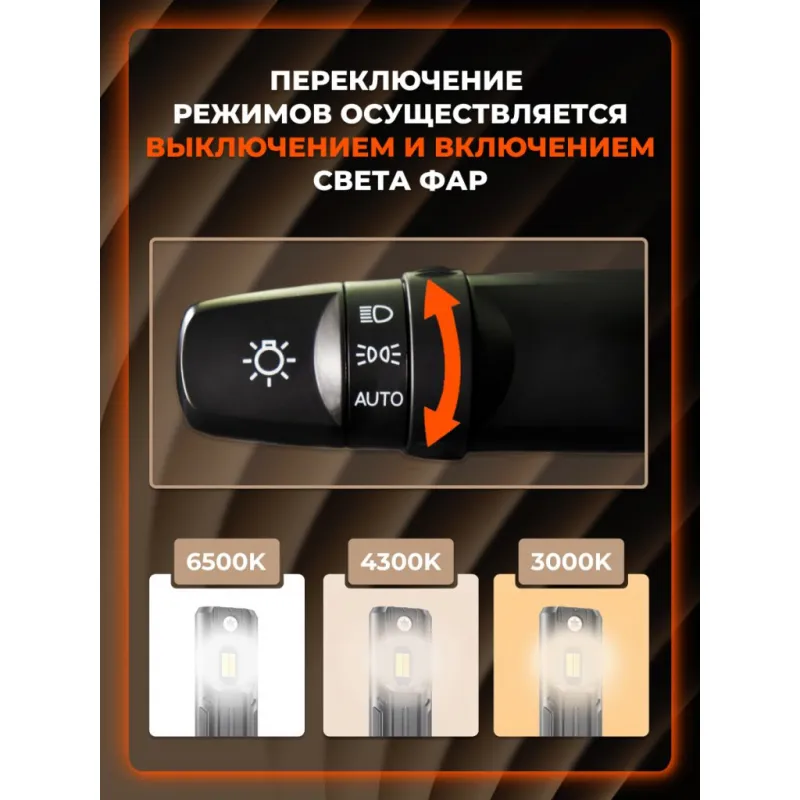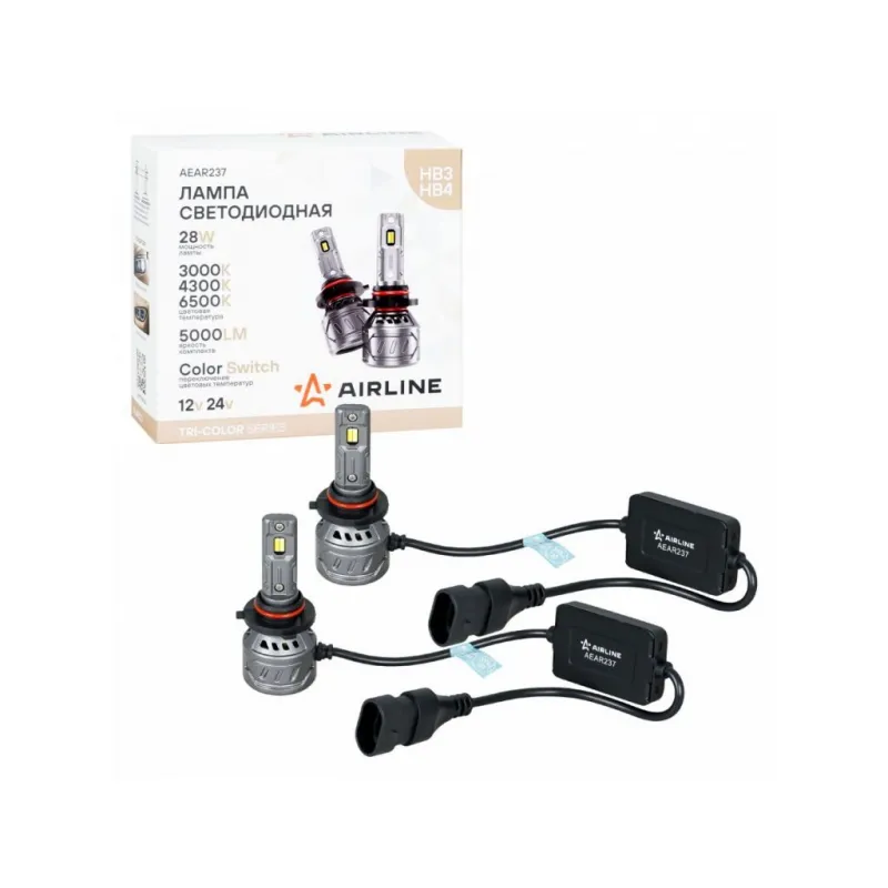 Лампа светодиодная HB3/HB4 TRI-COLOR, 28Вт, 5000Лм (2500Лм x 2), 3000/4300/6500K (Белый/Желтый), 12/24В, комплект 2 шт. МП-серия Описание: LED лампы AIRLINE AEAR283 с цоколем HB3/HB4 предназначены для рефлекторной и линзованной оптики, формируют четкую светотеневую границу, направляя световой поток на дорожное полотно и исключая ослепление встречных водителей, что повышает безопасность эксплуатации. Модель оснащена функцией переключения между тремя режимами цветовой температуры: – 3000К – жёлтый свет с высокой проникающей способностью; – 4300К – нейтральный белый свет; – 6500К – холодный белый свет, приближённый к дневному. Переключение режимов осуществляется последовательным включением и выключением лампы. Мощность одной LED лампы – 28Вт, напряжение – 12/24В, яркость комплекта из двух LED ламп – 5000Лм. В отличие от галогенных аналогов, светодиодные лампы потребляют меньше энергии, что снижает нагрузку на электросеть автомобиля и способствует её стабильной работе. Комбинированная система охлаждения, включающая пассивный радиатор и встроенный высокоэффективный вентилятор, обеспечивает надежный отвод тепла от светодиодов и предотвращает их перегрев. Алюминиевый корпус устойчив к коррозии и механическим воздействиям, дополнительно рассеивает тепло и продлевает срок службы ламп. Возможность регулировки угла положения ламп обеспечивает точную настройку светового потока для оптимального освещения. LED лампы предназначены для установки в дальний и ближний свет, а также в противотуманные фары. Устройства не предназначены для использования на дорогах общего пользования. Автосвет AIRLINE – надежное освещение для уверенной поездки в любых условиях. Характеристики: Артикул: AEAR283 Цоколь: HB3/HB4 Тип лампы: Светодиодная Номинальная мощность, Вт: 28 Температура свечения, К: 3000/4300/6500 Цвет свечения: Белый/Желтый Яркость комплекта, Лм: 5000 Напряжение, В: 12/24 Факт. потребляемый ток, А: 2.3 Тип светодиодного чипа: 4PCS-GC Тип оптики: Рефлекторная/Линзованная Тип охлаждения: Радиатор; Вентилятор Регулировка положения лампы: Есть Материал корпуса: Алюминий Комплектация: Лампа светодиодная - 2 шт Руководство по эксплуатации - 1 шт Упаковочная коробка - 1 шт Гарантийный талон - 1 шт Гарантия: от 1 года.