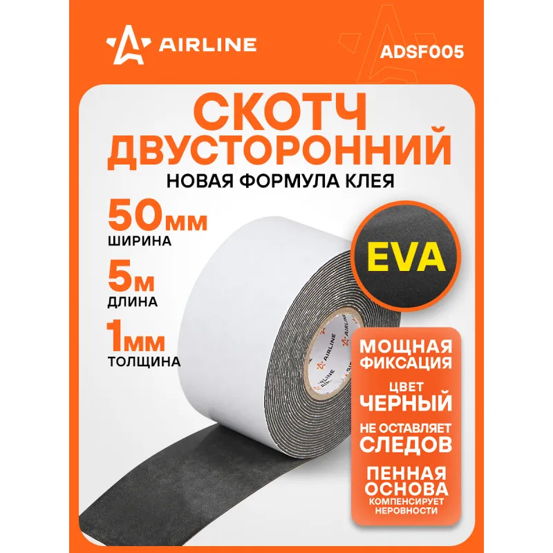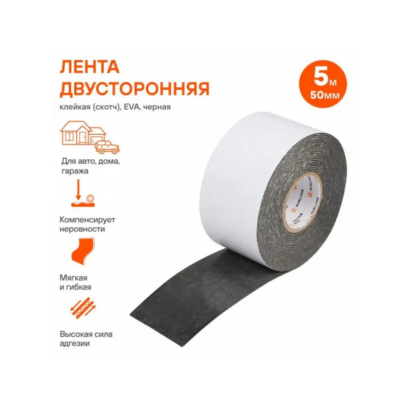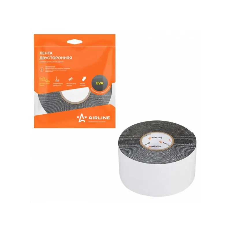 Лента двусторонняя клейкая (скотч), 50мм*5м, EVA вспененная основа, черная Описание: Двусторонний скотч 5 мх50 мм, EVA вспененная основа AIRLINE ADSF005 - универсален для декора и мелкого ремонта. Клеевая лента предназначена для соединения предметов между собой из различных материалов не портя их сверлением отверстий или нанесением клея. Мягкая и гибкая основа обеспечивает крепкое сцепление даже с неровными и структурированными поверхностям. Скотч обладает повышенной силой адгезии, поэтому идеально подойдет в качестве настенного крепления. Клейкая лента AIRLINE незаменима при ремонтных работах в автомобиле и гараже. Инструкция по применению: 1. Очистите поверхность от грязи, пыли и влаги. 2. Наклейте ленту на выбранный участок. Товар официального производителя AIRLINE. Полезный товар для дома, школы и офиса. Характеристики: Артикул: ADSF005 Ширина, мм: 50 Толщина ленты, мм: 1 Длина, м: 5 Горючесть: горючая Температура использования, С: -30/+50 Температура монтажа, °С: +5/+40 Цвет лайнера: белый Комплектация: Термоусадка с вкладышем - 1 шт Лента клейкая - 1 шт Гарантия: от 1 года.