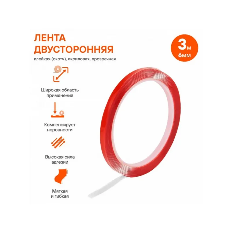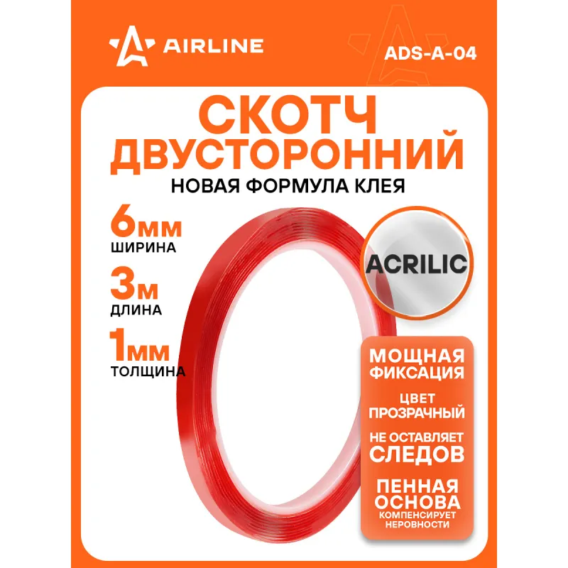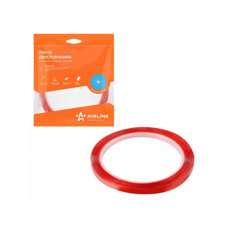 Лента двусторонняя клейкая (скотч), 6мм*3м, акриловая вспененная основа, прозрачная Описание: Двусторонний скотч 3 мх6 мм, акриловая вспененная основа AIRLINE ADS-A-04 - универсален для декора и мелкого ремонта. Клеевая лента предназначена для соединения предметов между собой из различных материалов не портя их сверлением отверстий или нанесением клея. Мягкая и гибкая основа обеспечивает крепкое сцепление даже с неровными и структурированными поверхностям. Скотч обладает повышенной силой адгезии, поэтому идеально подойдет в качестве настенного крепления, а также для различных материалов, таких как пластик, металл, дерево, стекло, керамика и т.д. Клейкая лента AIRLINE незаменима при ремонтных работах в автомобиле и гараже. Инструкция по применению: 1. Очистите поверхность от грязи, пыли и влаги. 2. Наклейте ленту на выбранный участок. Товар официального производителя AIRLINE. Полезный товар для дома, школы и офиса. Лента из акриловой пены может выдерживать большие нагрузки и длительные периоды эксплуатации. Характеристики: Артикул: ADS-A-04 Ширина, мм: 6 Горючесть: горючая Температура использования, С: -30/+50 Температура монтажа, °С: +5/+40 Толщина ленты, мм: 1 Длина, м: 3 Комплектация: Лента - 1 шт ПЭ пакет - 1 шт Гарантия: от 1 года.