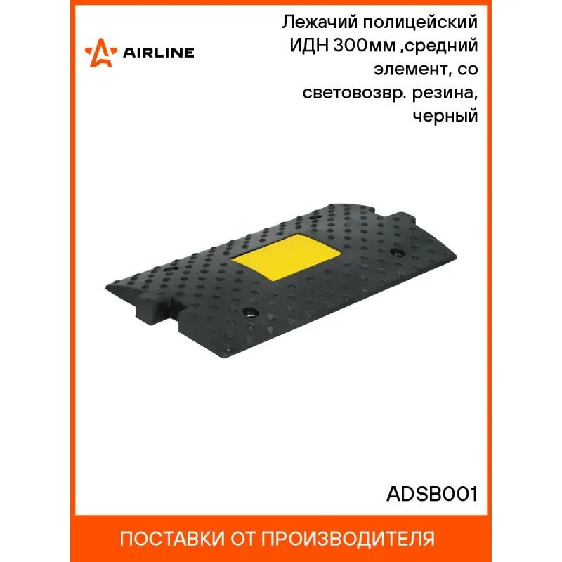 Лежачий полицейский ИДН 300мм(1),средний элемент, со световозвр. резина, черный Описание: ИДН 300(1) средний элемент лежачего полицейского из ударопрочной резины — расшифровывается как искусственная дорожная неровность, предназначенная для принудительного снижения скорости движения транспортных средств. Искусственная дорожная неровность(ИДН) изготовлена из ударопрочной резины высокого качества. На наружной поверхности элементов имеются выступы сферической формы для отличного сцепления с автомобильными шинами. Нижняя часть изделия имеет протектор, который обеспечивает надлежащий водоотвод. «Лежачие полицейские» повышают уровень безопасности за счет принудительного снижения скорости автотранспорта до 30 км/ч. ИДН- это идеальное решение для снижения скорости транспортного потока на территории паркинга, гаражах, во дворах жилых комплексов и прилегающих территориях. ИДН 300(1) средний элемент изготовленный из РЕЗИНЫ, крепится к поверхности при помощи четырёх анкерных болтов 10х100 мм и может быть установлена с двумя концевыми элементами ИДН 300(2). Характеристики товара: Материал изготовления: Ударопрочная резина Длина по переезду, мм: 300 Ширина, мм: 500 Высота, мм: 35 Армирование металлокордом: Нет Количество светоотражателей, шт.: 1 Размеры одного светоотражателя, мм: 155х120 Цвет светоотражателя: ярко-желтый Количество крепёжных отверстий, шт.: 4 Диаметр крепёжных отверстий, мм: 11 Диаметр окна крепёжного отверстия, мм: 25 Армирование крепёжных отверстий: Да Температура эксплуатации: От -50°C до +60°C Характеристики: Артикул: ADSB001 Цвет: черный Материал: резина Вид: Ударопрочный Мин. температура эксплуатации, °С: -50 Макс. температура эксплуатации, °С: 60 Комплектация: Основной (средний элемент) - 1 шт Гарантия: от 1 года.