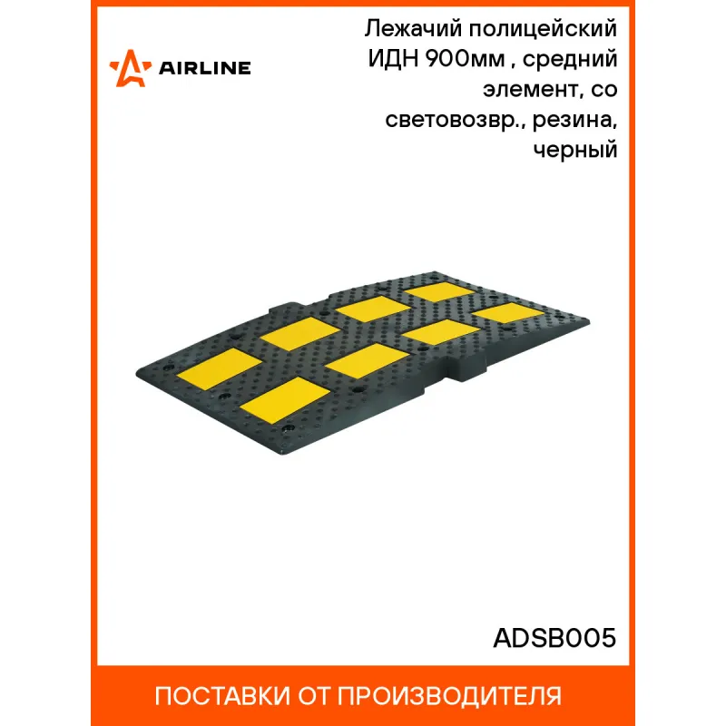 Лежачий полицейский ИДН 900мм(1), средний элемент, со световозвр., резина, черный Описание: ИДН (1) 900мм- средний элемент лежачего полицейского из ударопрочной резины — Лежачий полицейский — это искусственная неровность на дороге, которая предназначена для принудительного снижения максимально допустимой скорости движения транспортных средств до 30 км/ч, в целях обеспечения безопасности пешеходов. Устанавливают в местах большой проходимости пешеходов таких как учебные заведения, больницы, общественные центры, перекрестки, паркинги и т.д. Искусственная дорожная неровность ИДН (1) 900мм - это основной элемент, изготовленный из ударопрочной резины высокого качества. На наружной поверхности элементов имеются выступы сферической формы для отличного сцепления с автомобильными шинами. Нижняя часть изделия имеет протектор, который обеспечивает надлежащий водоотвод. Крепежные отверстия армированы металлическими дисками 50 х 3 мм, что увеличивает прижимную способность изделия и исключает его вырывание. Для обеспечения видимости лежачего полицейского он оснащается восемью светоотражающими элементами ярко-желтого цвета. ИДН 900-1 основной элемент РЕЗИНА, крепится к поверхности при помощи 12 анкерных болтов и может быть установлен с двумя концевыми элементами ИДН 900-2. Допускается устройство ИДН: - на улицах районного и местного значения, боковых и местных проездах магистралей; - в начале опасного участка перед местами массового скопления людей; - перед опасными участками дорог, на которых введено ограничение скорости движения; - перед нерегулируемыми перекрестками с необеспеченной видимостью транспортных средств, приближающихся по пересекаемой дороге; - по всей зоне действия знака 1.23 "Дети" через 50 м друг от друга; - перед воротами гаражей, внеуличных стояночных площадок, выездами с территорий автозаправочных комплексов, на дорогах и проездах парковых зон. Характеристики товара: Материал изготовления: Ударопрочная резина Длина по переезду: 900 мм Ширина: 500 мм Высота: 58 мм Количество светоотражателей: 8 шт. Размеры одного светоотражателя: 150х110 мм Цвет светоотражателя: ярко-желтый Количество крепёжных отверстий: 12 шт. Диаметр крепёжных отверстий: 11 мм Диаметр окна крепёжного отверстия: 25 мм Армирование крепёжных отверстий: Да Температура эксплуатации: От -50°C до +60°C Характеристики: Артикул: ADSB005 Цвет: черный Вид: Ударопрочный Материал: резина Диаметр верхнего отверстия, мм: 40 Мин. температура эксплуатации, °С: -50 Макс. температура эксплуатации, °С: 60 Комплектация: Основной(средний) элемент - 1 шт Гарантия: от 1 года.