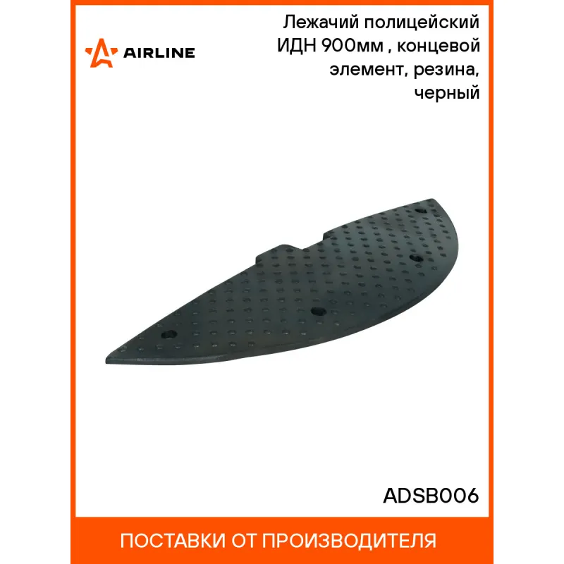 Лежачий полицейский ИДН 900мм(2), концевой элемент, резина, черный Описание: ИДН 900(2)-концевой элемент РЕЗИНА - это завершающая часть искусственной дорожной неровности, изготовленная из ударопрочной резины высокого качества. ИДН-900-2 предназначена для принудительного снижения скорости движения транспортных средств до 30 км/ч, в целях обеспечения безопасности пешеходов. Устанавливается в местах большой проходимости пешеходов таких как учебные заведения, больницы, общественные центры, перекрестки, паркинги и т.д. На наружной поверхности элементов ИДН 900-2 имеются выступы сферической формы для отличного сцепления с автомобильными шинами. Нижняя часть изделия имеет протектор, который обеспечивает надлежащий водоотвод. Крепежные отверстия армированы металлическими дисками 50 х 3 мм, что увеличивает прижимную способность изделия и исключает его вырывание. ИДН 900-2 РЕЗИНА крепится к поверхности при помощи четырёх анкерных болтов 10х100 мм и устанавливается совместно с основным элементом ИДН 900-1. Крепеж и основные элементы можно приобрести в нашем магазине отдельно: Допускается устройство ИДН: - на улицах районного и местного значения, боковых и местных проездах магистралей; - в начале опасного участка перед местами массового скопления людей; - перед опасными участками дорог, на которых введено ограничение скорости движения; - перед нерегулируемыми перекрестками с необеспеченной видимостью транспортных средств, приближающихся по пересекаемой дороге; - по всей зоне действия знака 1.23 "Дети" через 50 м друг от друга; - перед воротами гаражей, внеуличных стояночных площадок, выездами с территорий автозаправочных комплексов, на дорогах и проездах парковых зон. Характеристики товара Материал изготовления: Ударопрочная резина Длина по переезду: 900 мм Ширина: 250 мм Высота: 58 мм Наличие светоотражателей: Не предусмотрено Количество крепёжных отверстий: 4 шт. Диаметр крепёжных отверстий: 11 мм Диаметр окна крепёжного отверстия: 25 мм Армирование крепёжных отверстий: Да Температура эксплуатации: От -50°C до +60°C Характеристики: Артикул: ADSB006 Цвет: черный Материал: резина Вид: Ударопрочный Макс. температура эксплуатации, °С: 40 Мин. температура эксплуатации, °С: -50 Комплектация: Концевой элемент ИДН(2) - 1 шт Гарантия: от 1 года.